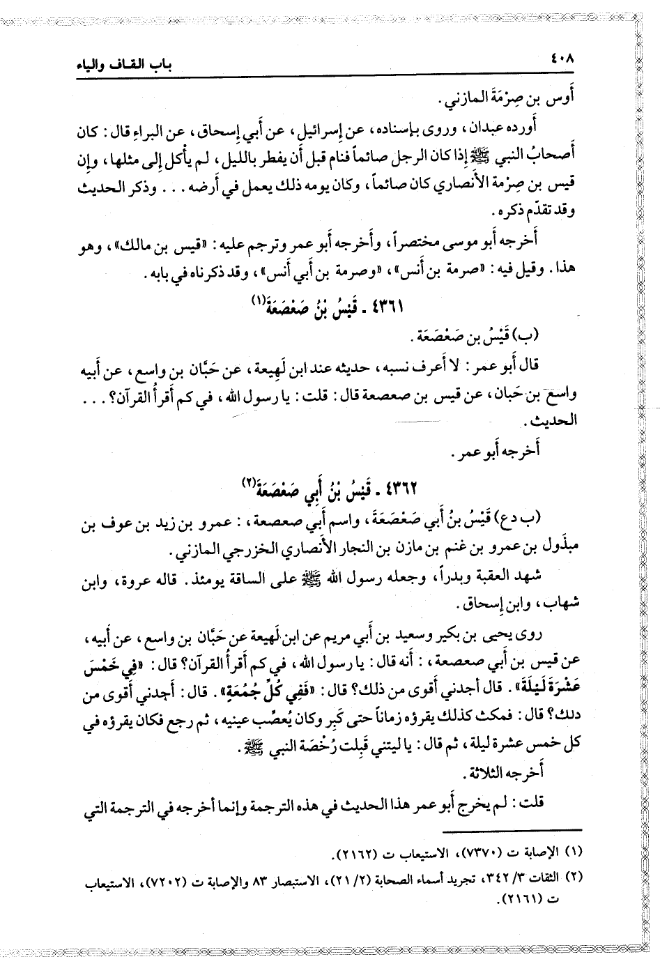 ب: قيس بْن صعصعة قَالَ أَبُو عُمَر: لا أعرف نسبه، حديثه عند ابْن لهيعة، عَنْ حبان بْن واسع، عَنْ أَبِيهِ واسع بْن حبان، عَنْ قيس بْن صعصعة، قَالَ: قلت: يا رَسُول اللَّه، فِي كم أقرأ القرآن؟ ...