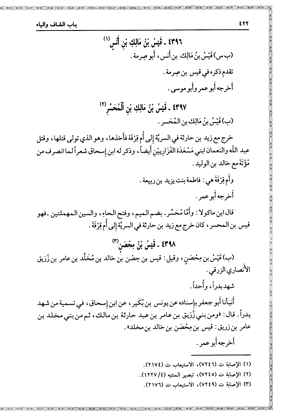 ب: قيس بْن محصن وقيل: قيس بْن حصن بْن خَالِد بْن مخلد بْن عَامِر بْن زريق الْأَنْصَارِيّ الزرقي شهد بدرًا، وأحدًا.