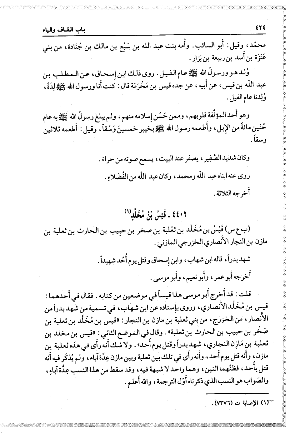 قلت: قَدْ أخرج أَبُو مُوسَى هَذَا قيسًا في موضعين من كتابه، فَقَالَ فِي أحدهما: قيس بْن مخلد الأنصاري، وروى بِإِسْنَادِهِ عَنِ ابْنِ شهاب، فِي تسمية من شهد بدرًا من الأنصار، من الخزرج، من بني ثعلبة بْن مازن بْن النجار: قيس بْن مخلد بْن ثعلبة بْن صخر بْن حبيب بْن الحارث بْن ثعلبة، وقَالَ فِي الموضع الثَّاني: قيس بْنُ مخلد بْن ثعلبة بْن مازن النجاري، شهد بدرًا، وقتل يَوْم أحد، ولا شك أَنَّهُ رَأَى فِي هَذِهِ ثعلبة بْن مازن، وأنَّه قتل يَوْم أحد، وأنَّه رَأَى فِي تلك بين ثعلبة وبين مازن عدة آباء، ولم يذكر فِيهِ أَنَّهُ قتل بأحد، فظنهما اثنين، وهما واحد لا شبهة فِيهِ، وَقَدْ سقط من هَذَا النسب عدة آباء، والصواب هُوَ النسب الَّذِي ذكرناه أول الترجمة، والله أعلم.