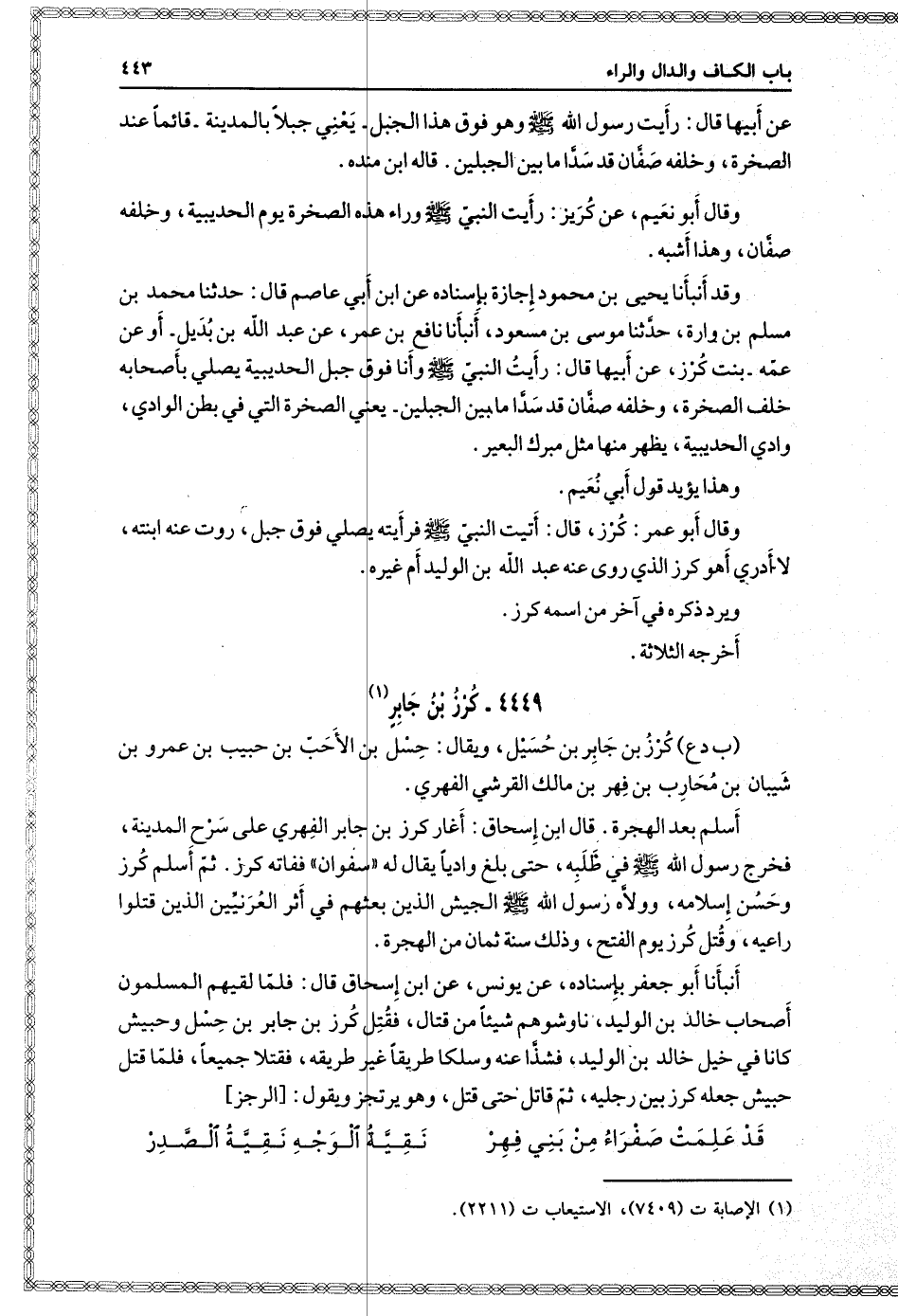 (١٤٠٢) أَنْبَأَنَا أَبُو جَعْفَر بِإِسْنَادِهِ، عَنْ يونس، عَنِ ابْنِ إِسْحَاق، قَالَ: فلما لقيهم المسلمون أصحاب خَالِد بْن الْوَلِيد، ناوشوهم شيئًا من قتال، فقتل كرز بْن جابر بْن حسل، وحبيش كانا فِي خيل خَالِد بْن الْوَلِيد، فشذا عَنْهُ، وسلكا طريقًا غير طريقه، فقتلا جميعًا، فلما قتل حبيش جعله كرز بين رجليه، ثُمَّ قاتل حتَّى قتل، وهو يرتجز، ويقول: