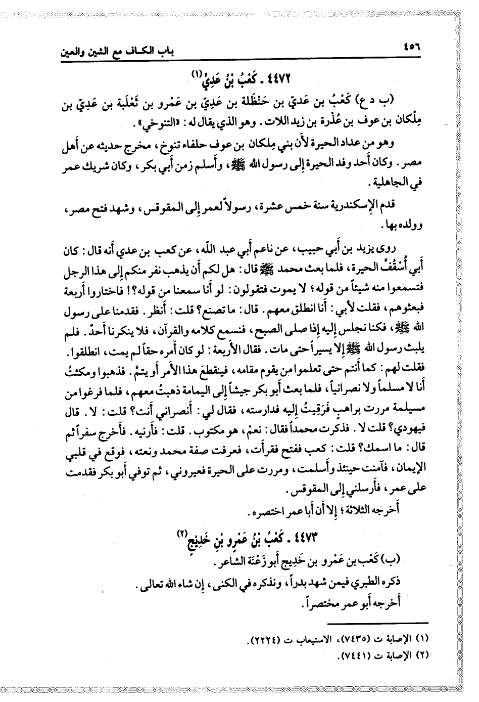 ٢٣٠١ روى يزيد بْن أَبِي حبيب، عَنْ ناعم أَبِي عَبْد اللَّه، عَنْ كعب بْن عدي، أَنَّهُ قَالَ: كَانَ أَبِي أسقف الحيرة، فلما بعث مُحَمَّد صَلَّى اللَّهُ عَلَيْهِ وَسَلَّمَ قَالَ: هَلْ لكم أن يذهب نفر منكم إِلَى هَذَا الرجل فتسمعوا مِنْهُ شيئًا من قولُه، لا يموت، فتقولون: لو أَنَا سمعنا من قولُه؟ ! فاختاروا أربعة فبعثوهم، فقلت لأبي: أَنَا أنطلق معهم، قَالَ: ما تصنع؟ قلت: أنظر، فقدمنا عَلَى رَسُول اللَّه صَلَّى اللَّهُ عَلَيْهِ وَسَلَّمَ فكنا نجلس إِلَيْه إِذَا صلى الصبح، فنسمع كلامه والقرآن، فلا ينكرنا أحد، فلم يلبث رَسُول اللَّه صَلَّى اللَّهُ عَلَيْهِ وَسَلَّمَ إلا يسيرًا حتَّى مات، فَقَالَ الأربعة: لو كَانَ أمره حقًا لم يمت، انطلقوا، فقلت لهم: كما أنتم حتَّى تعلموا من يقوم مقامه، فينقطع هَذَا الأمر أَوْ يتم، فذهبوا ومكثت أَنَا لا مسلمًا ولا نصرانيًا، فلما بعث أَبُو بَكْر جيشًا إِلَى اليمامة ذهبت معهم، فلما فرغوا من مسيلمة مررت براهب فرقيت إِلَيْه فدارسته، فَقَالَ لي: أنصراني أنت؟ قلت: لا، قَالَ: فيهودي؟ قلت: لا، فذكرت محمدًا، فَقَالَ: نعم، هُوَ مكتوب، قلت: فأرنيه، فأخرج سفرًا، ثُمَّ قَالَ: ما اسمك؟ قلت: كعب، ففتح فقرأت، فعرفت صفة مُحَمَّد ونعته، فوقع فِي قلبي الْإِيمَان، فآمنت حينئذ وأسلمت، ومررت عَلَى الحيرة فعيروني، ثُمَّ توفي أَبُو بَكْر فقدمت عَلَى عُمَر، فأرسلني إِلَى المقوقس.