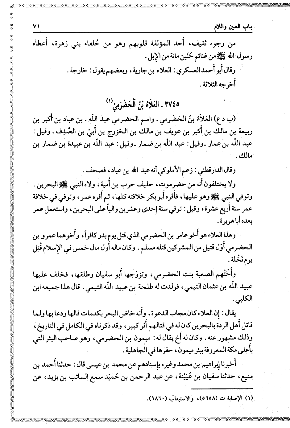 ولا يختلفون أَنَّهُ من حضرموت، حليف حرب بْن أمية، ولاه النَّبِيّ صَلَّى اللَّهُ عَلَيْهِ وَسَلَّمَ البحرين، وتوفي النَّبِيّ صَلَّى اللَّهُ عَلَيْهِ وَسَلَّمَ وهو عليها، فأقره أَبُو بَكْر خلافته كلها، ثُمَّ أقره عُمَر، وتوفي فِي خلافة عُمَر سنة أربع عشرة، وقيل: توفي سنة إحدى وعشرين واليًا عَلَى البحرين، واستعمل عُمَر بعده أبا هُرَيْرَةَ.