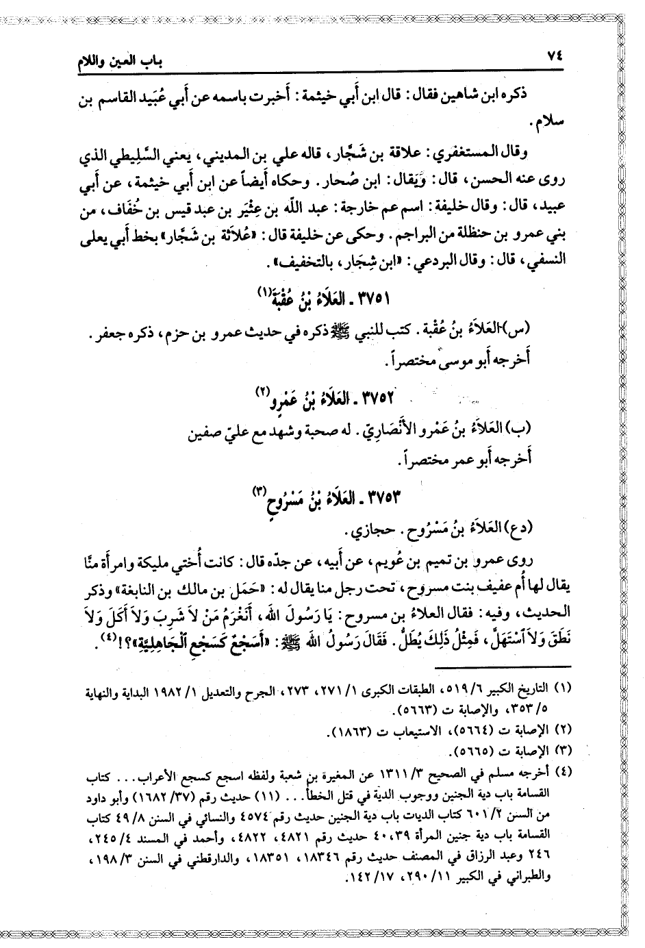 رَوَى عَمْرُو بْنُ تَمِيمِ بْنِ عُوَيْمٍ، عَنْ أَبِيهِ، عَنْ جَدِّهِ، قَالَ: كَانَتْ أُخْتِي مُلَيْكَةُ، وَامْرَأَةٌ مِنَّا يُقَالُ لَهَا: أُمُّ عَفِيفٍ بِنْتُ مَسْرُوحٍ، تَحْتَ رَجُلٍ مِنَّا يُقَالُ لَهُ: حَمَلُ بْنُ مَالِكِ بْنِ النَّابِغَةِ، وَذَكَرَ الْحَدِيثَ، وَفِيهِ: فَقَالَ الْعَلاءُ بْنُ مَسْرُوحٍ: يَا رَسُولَ اللَّهِ، أَنَغْرَمُ مَنْ لا شَرِبَ، وَلا أَكَلَ، وَلا نَطَقَ، وَلا اسْتَهَلَّ، فَمِثْلُ ذَلِكَ يُطَلُّ، فَقَالَ رَسُولُ اللَّهِ صَلَّى اللَّهُ عَلَيْهِ وَسَلَّمَ: " أَسَجْعٌ كَسَجْعِ الْجَاهِلِيَّةِ ".