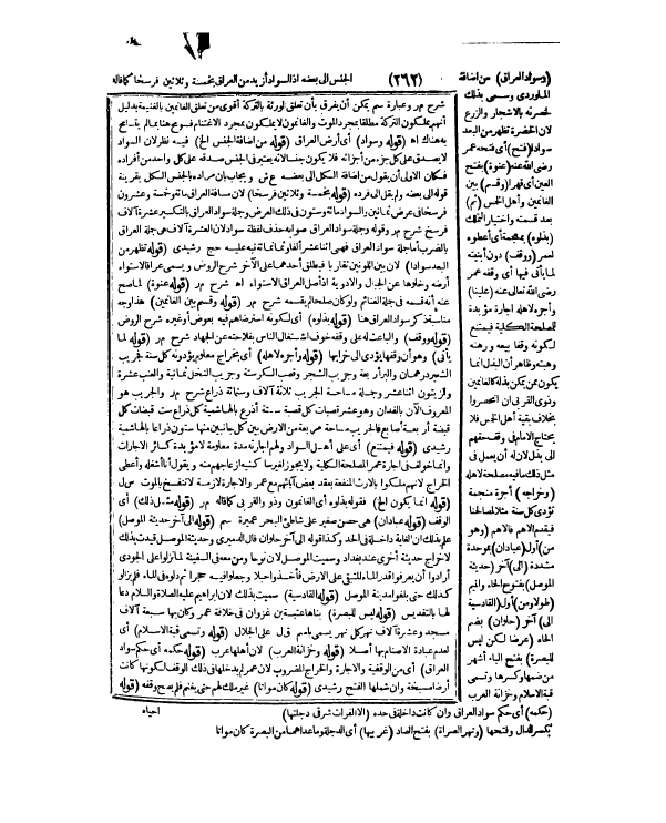 (قَوْلُهُ: بِخَمْسَةٍ وَثَلَاثِينَ فَرْسَخًا) ؛ لِأَنَّ مَسَافَةَ الْعِرَاقِ مِائَةٌ وَخَمْسَةٌ وَعِشْرُونَ فَرْسَخًا فِي عَرْضِ ثَمَانِينَ، وَالسَّوَادُ مِائَةٌ وَسِتُّونَ فِي ذَلِكَ الْعَرْضِ وَجُمْلَةُ سَوَادِ الْعِرَاقِ بِالتَّكْسِيرِ عَشْرَةُ آلَافِ فَرْسَخٍ شَرْحُ م ر وَقَوْلُهُ: وَجُمْلَةُ سَوَادِ الْعِرَاقِ صَوَابُهُ حَذْفُ لَفْظَةِ سَوَادُ؛ لِأَنَّ الْعَشَرَةَ آلَافٍ هِيَ جُمْلَةُ الْعِرَاقِ بِالضَّرْبِ أَمَّا جُمْلَةُ سَوَادِ الْعِرَاقِ فَهِيَ اثْنَا عَشَرَ أَلْفًا وَثَمَانُمِائَةٍ نَبَّهَ عَلَيْهِ حَجّ رَشِيدِيٌّ (قَوْلُهُ: تَظْهَرُ مِنْ الْبُعْدِ سَوَادًا) لِأَنَّ بَيْنَ اللَّوْنَيْنِ تَقَارُبًا فَيُطْلَقُ أَحَدُهُمَا عَلَى الْآخَرِ شَرْحُ الرَّوْضِ وَيُسَمَّى عِرَاقًا لِاسْتِوَاءِ أَرْضِهِ وَخُلُوِّهَا عَنْ الْجِبَالِ، وَالْأَوْدِيَةِ إذْ أَصْلُ الْعِرَاقِ الِاسْتِوَاءُ اهـ شَرْحُ م ر (قَوْلُهُ: عَنْوَةً) لِمَا صَحَّ عَنْهُ أَنَّهُ قَسَمَهُ فِي جُمْلَةِ الْغَنَائِمِ وَلَوْ كَانَ صُلْحًا لَمْ يَقْسِمْهُ شَرْحُ م ر (قَوْلُهُ: وَقُسِمَ بَيْنَ الْغَانِمِينَ) هَذَا وَجْهُ مُنَاسَبَةِ ذِكْرِ سَوَادِ الْعِرَاقِ هُنَا.