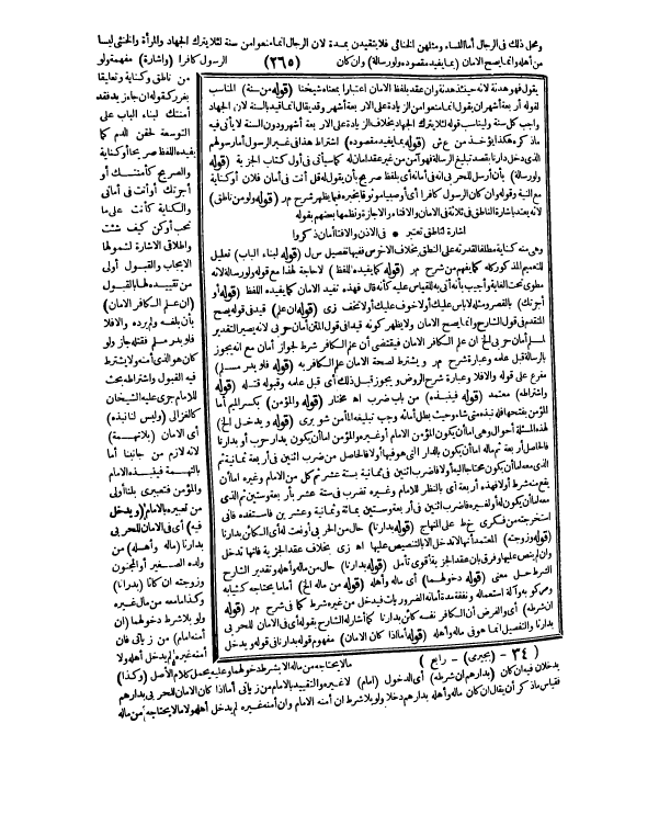 . (قَوْلُهُ:، وَيَدْخُلُ إلَخْ) لِهَذِهِ الْمَسْأَلَةِ أَحْوَالٌ وَهِيَ إمَّا أَنْ يَكُونَ الْمُؤَمِّنُ الْإِمَامَ أَوْ غَيْرَهُ، وَالْمُؤَمَّنُ إمَّا أَنْ يَكُونَ بِدَارِ حَرْبٍ أَوْ بِدَارِنَا فَالْحَاصِلُ أَرْبَعَةٌ، ثُمَّ مَالُهُ إمَّا أَنْ يَكُونَ بِالدَّارِ الَّتِي هُوَ فِيهَا أَوْ لَا، فَالْحَاصِلُ مِنْ ضَرْبِ اثْنَيْنِ فِي أَرْبَعَةٍ ثَمَانِيَةٌ، ثُمَّ الَّذِي مَعَهُ إمَّا أَنْ يَكُونَ مُحْتَاجًا إلَيْهِ أَوْ لَا، فَاضْرِبْ اثْنَيْنِ فِي ثَمَانِيَةٍ بِسِتَّةَ عَشَرَ ثُمَّ كُلٌّ مِنْ الْإِمَامِ وَغَيْرِهِ إمَّا أَنْ يَقَعَ مِنْهُ شَرْطٌ أَوْ لَا، فَهَذِهِ أَرْبَعَةٌ أَيْ: بِالنَّظَرِ لِلْإِمَامِ وَغَيْرِهِ تُضْرَبُ فِي سِتَّةَ عَشَرَ بِأَرْبَعَةٍ وَسِتِّينَ، ثُمَّ الَّذِي مَعَهُ إمَّا أَنْ يَكُونَ لَهُ أَوْ لِغَيْرِهِ فَاضْرِبْ اثْنَيْنِ فِي أَرْبَعَةٍ وَسِتِّينَ بِمِائَةٍ وَثَمَانِيَةٍ وَعِشْرِينَ. فَاسْتَفِدْهُ فَإِنِّي اسْتَخْرَجْتُهُ مِنْ فِكْرِي خ ط عَلَى الْمِنْهَاجِ (قَوْلُهُ: بِدَارِنَا) حَالٌ مِنْ الْحَرْبِيِّ أَوْ نَعْتٌ لَهُ أَيْ: الْكَائِنِ بِدَارِنَا (قَوْلُهُ: وَزَوْجَتِهِ) الْمُعْتَمَدُ أَنَّهَا لَا تَدْخُلُ إلَّا بِالتَّنْصِيصِ عَلَيْهَا. اهـ. ز ي بِخِلَافِ عَقْدِ الْجِزْيَةِ فَإِنَّهَا تَدْخُلُ، وَإِنْ لَمْ يَنُصَّ عَلَيْهَا وَفَرَّقَ بِأَنَّ عَقْدَ الْجِزْيَةِ أَقْوَى تَأَمَّلْ.