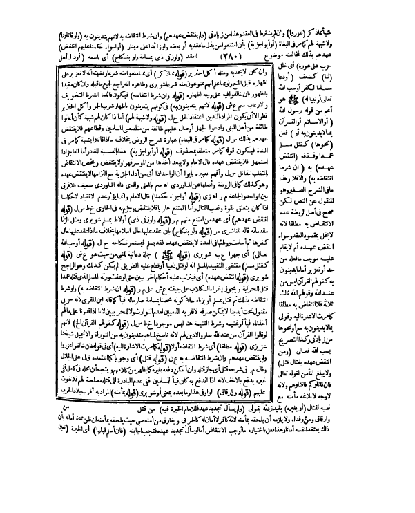 (وَلَوْ زَنَى ذِمِّيٌّ بِمُسْلِمَةٍ وَلَوْ بِنِكَاحٍ) أَيْ: بِاسْمِهِ (أَوْ دَلَّ أَهْلُ حَرْبٍ عَلَى عَوْرَةٍ) أَيْ: خَلَلٍ (لَنَا) كَضَعْفٍ (أَوْ دَعَا مُسْلِمًا لِلْكُفْرِ أَوْ سَبَّ اللَّهَ) تَعَالَى (أَوْ نَبِيًّا لَهُ) - صَلَّى اللَّهُ عَلَيْهِ وَسَلَّمَ - هُوَ أَعَمُّ مِنْ قَوْلِهِ: رَسُولَ اللَّهِ (أَوْ الْإِسْلَامَ أَوْ الْقُرْآنَ بِمَا لَا يَدِينُونَ بِهِ أَوْ) فَعَلَ (نَحْوَهَا) كَقَتْلِ مُسْلِمٍ عَمْدًا وَقَذْفِهِ (انْتَقَضَ عَهْدُهُ) بِهِ (إنْ شُرِطَ انْتِقَاضُهُ بِهِ) وَإِلَّا فَلَا، وَهَذَا مَا فِي الشَّرْحِ الصَّغِيرِ وَهُوَ الْمَنْقُولُ فِي النَّصِّ لَكِنْ صَحَّحَ فِي أَصْلِ الرَّوْضَةِ عَدَمَ الِانْتِقَاضِ بِهِ مُطْلَقًا؛ لِأَنَّهُ لَا يُخِلُّ بِمَقْصُودِ الْعَقْدِ وَسَوَاءٌ انْتَقَضَ عَهْدُهُ أَمْ لَا يُقَامُ عَلَيْهِ مُوجِبُ مَا فَعَلَهُ مِنْ حَدٍّ أَوْ تَعْزِيرٍ، أَمَّا مَا يَدِينُونَ بِهِ كَقَوْلِهِمْ: الْقُرْآنُ لَيْسَ مِنْ عِنْدِ اللَّهِ وَقَوْلِهِمْ: اللَّهُ ثَالِثُ ثَلَاثَةٍ فَلَا انْتِقَاضَ بِهِ مُطْلَقًا كَمَا مَرَّتْ الْإِشَارَةُ إلَيْهِ وَقَوْلِي: بِمَا لَا يَدِينُونَ بِهِ مَعَ أَوْ نَحْوُهَا مِنْ زِيَادَتِي، وَكَذَا التَّصْرِيحُ بِسَبِّ اللَّهِ تَعَالَى.