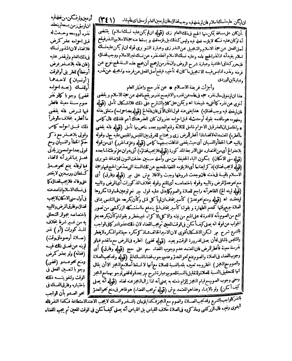 إنْ لَمْ يَكُنْ عَلَيْهِ نُسُكُ إسْلَامٍ فَإِنْ لَمْ يَفْعَلْهُ فِيهِ وَجَبَ قَضَاؤُهُ فَإِنْ لَمْ يُعَيِّنْ الْعَامَ لَزِمَهُ فِي أَيِّ عَامٍ شَاءَ أَوْ عَيَّنَ وَلَمْ يَتَمَكَّنْ مِنْ فِعْلِهِ فِيهِ بِأَنْ لَمْ يَبْقَ زَمَنٌ يَسَعُهُ لَمْ يَنْعَقِدْ نَذْرُهُ أَوْ وَسِعَهُ وَحَدَثَ لَهُ قَبْلَ إحْرَامِهِ عُذْرٌ كَمَرَضٍ فَلَا قَضَاءَ لِأَنَّ الْمَنْذُورَ نُسُكٌ فِي ذَلِكَ الْعَامِ وَلَمْ يَقْدِرْ عَلَيْهِ (فَإِنْ فَاتَهُ بِلَا عُذْرٍ أَوْ بِمَرَضٍ أَوْ خَطَأٍ) لِلطَّرِيقِ أَوْ الْوَقْتِ (أَوْ نِسْيَانٍ) لِأَحَدِهِمَا أَوْ لِلنُّسُكِ (بَعْدَ إحْرَامِهِ قُضِيَ) وُجُوبًا كَمَا لَوْ نَذَرَ صَوْمَ سَنَةٍ مُعَيَّنَةٍ فَأَفْطَرَ فِيهَا لِمَرَضٍ فَإِنَّهُ يَقْضِي مَا أَفْطَرَهُ بِخِلَافِ مَا لَوْ طَرَأَ ذَلِكَ قَبْلَ إحْرَامِهِ كَمَا مَرَّ وَقَوْلِي بِلَا عُذْرٍ مَعَ ذِكْرِ حُكْمِ الْخَطَأِ وَالنِّسْيَانِ وَمَعَ قَوْلِي بَعْدَ إحْرَامِهِ مِنْ زِيَادَتِي فَعُلِمَ بِمَا تَقَرَّرَ أَنَّهُ لَا قَضَاءَ فِيمَا لَوْ فَاتَهُ بِمَنْعِ نَحْوِ عَدُوٍّ كَسُلْطَانٍ وَرَبِّ دَيْنٍ لَا يَقْدِرُ عَلَى وَفَائِهِ فَلَا يَجِبُ قَضَاؤُهُ كَمَا فِي نُسُكِ الْإِسْلَامِ إذَا صُدَّ عَنْهُ فِي أَوَّلِ سِنِي الْإِمْكَانِ لَا يَجِبُ قَضَاؤُهُ وَفَارَقَ الْمَرَضَ وَتَالِيَيْهِ بِاخْتِصَاصِهِ بِجَوَازِ التَّحَلُّلِ بِهِ مِنْ غَيْرِ شَرْطٍ بِخِلَافِ الْمَذْكُورَاتِ