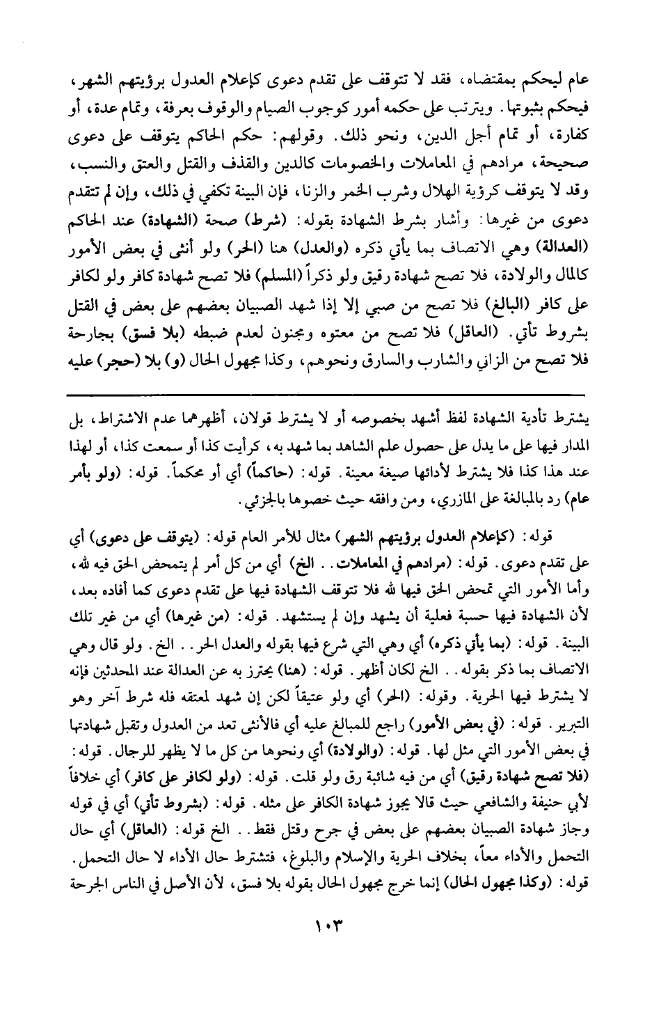 يشترط في تأدية الشهادة لفظ أشهد بخصوصه أو لا يشترط ؟ قولان أظهرهما عدم الاشتراط بل المدار فيها على ما يدل على حصول علم الشاهد بما شهد به كرأيت كذا أو سمعت كذا أو لهذا عند هذا كذا فلا يشترط لأدائها صيغة معينة . قوله : 16 ( ولو بأمر عام ) : رد بالمبالغة على المازري و من وافقه حيث خصوها بالجزئي . قوله : 16 ( كإعلام العدول برؤيتهم الشهر ) : مثال للأمر العام . قوله : 16 ( يتوقف على دعوى ) : أي على تقدم دعوى . قوله : 16 ( مرادهم في المعاملات ) الخ : أي من كل أمر لم يتمحض الحق فيه لله ، و أما الأمور التي التي تمحض الحق فيها لله فلا تتوقف الشهادة فيها على تقدم دعوى كما أفاده ، بعد لأن الشهادة فيها حسبة فعليه أن يشهد و إن لم يستشهد . قوله : 16 ( من غيرها ) : أي من غير تلك البينة . قوله : 16 ( بما يأتي ذكره ) : أي و هي التي شرع فيها بقوله : و العدل الحر الخ ، ولو قال و هي الاتصاف بما ذكره بقوله الخ لكان أظهر . قوله : 16 ( هنا ) : يحترز به عن العدالة عن المحدثين فأنه لا يشترط فيها الحرية . و قوله : 16 ( الحر ) : أي ولو عتيقاً لكن إن شهد لمعتقه فله شرط اخر وهو التبريز . قوله : 16 ( في بعض الأمور ) راجع للمبالغ عليه أي فالأنثى تعدُّ من العدول و تقبل شهادتها في بعض الأمور التي مثل لها . قوله : 16 ( و الولادة ) : ) ) 16 ( 16 ( أي و نحوها من كل ما لا يظهر للرجال . قوله : 16 ( فلا تصح شهادة رقيق ) : أي من فيه شائبة رق ولو قلت . قوله : 16 ( ولو لكافر على كافر ) : أي خلافاً لأبي حنيفة و الشافعي حيث قالا : يجوز شهادة الكافر على مثله . قوله : 16 ( بشروط تأتي ) : أي في قوله و جاز شهادة الصبيان بعضهم على بعض في جرح و قتل فقط الخ . قوله : 16 ( العاقل ) : أي حال التحمل و الأداء معاً . بخلاف الحرية و الأسلام و البلوغ فتشترط حال الأداء لا حال التحمل . قوله : 16 ( و كذا مجهول الحال ) : إنما خرج مجهول الحال بقوله بلا فسق ؛ لأن الأصل في الناس الجرحة