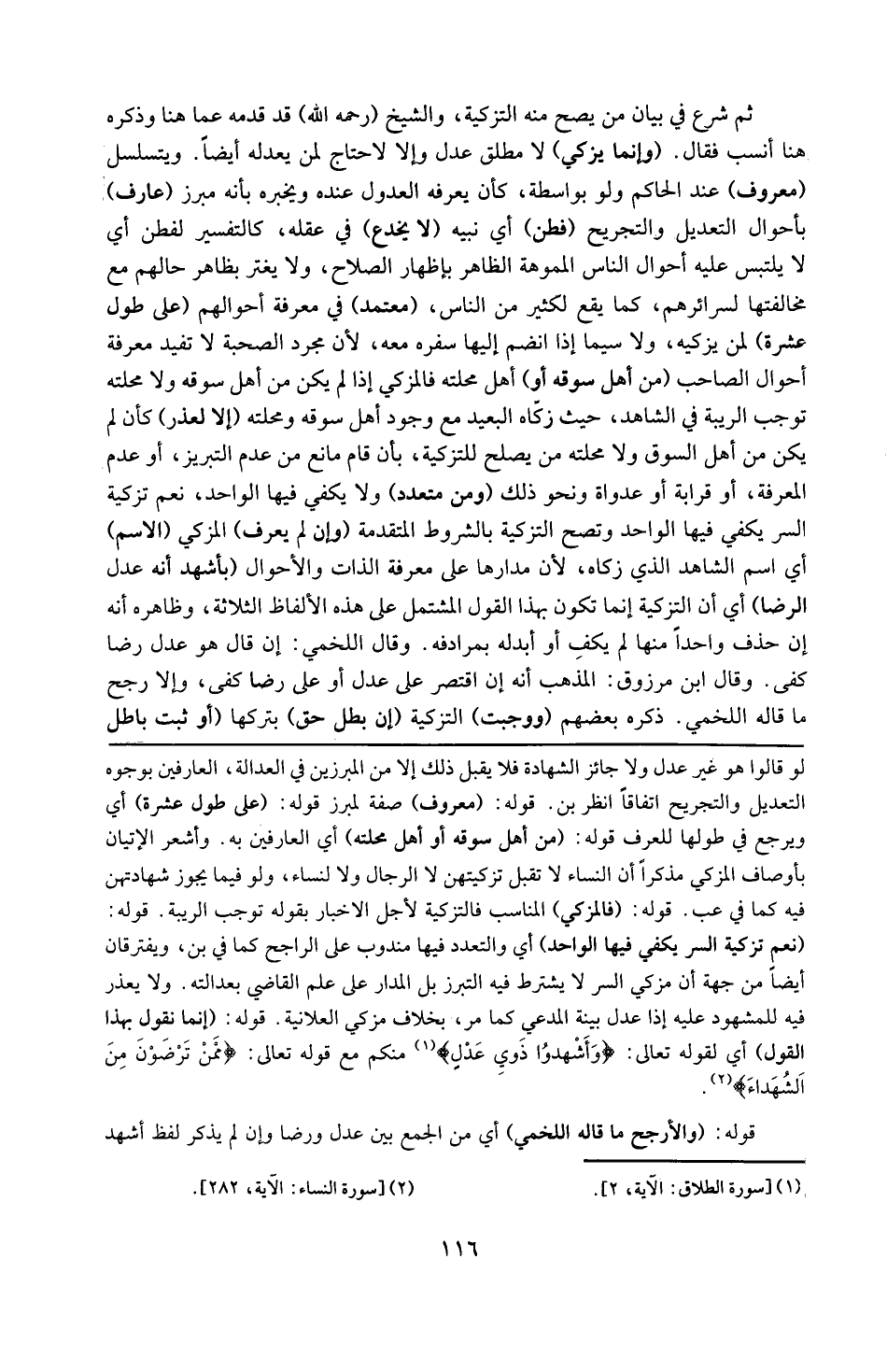 قوله : 16 ( من أهل سوقه أو أهل محلته ) : أي العارفين به و أشعر الإتيان بأصاف المزكى مذكراً أن النساء لا تقبل تزكيتهن لا لرجال و لا لنساء و لو فيما يجوز شهادتهن فيه كما في ( عب ) .