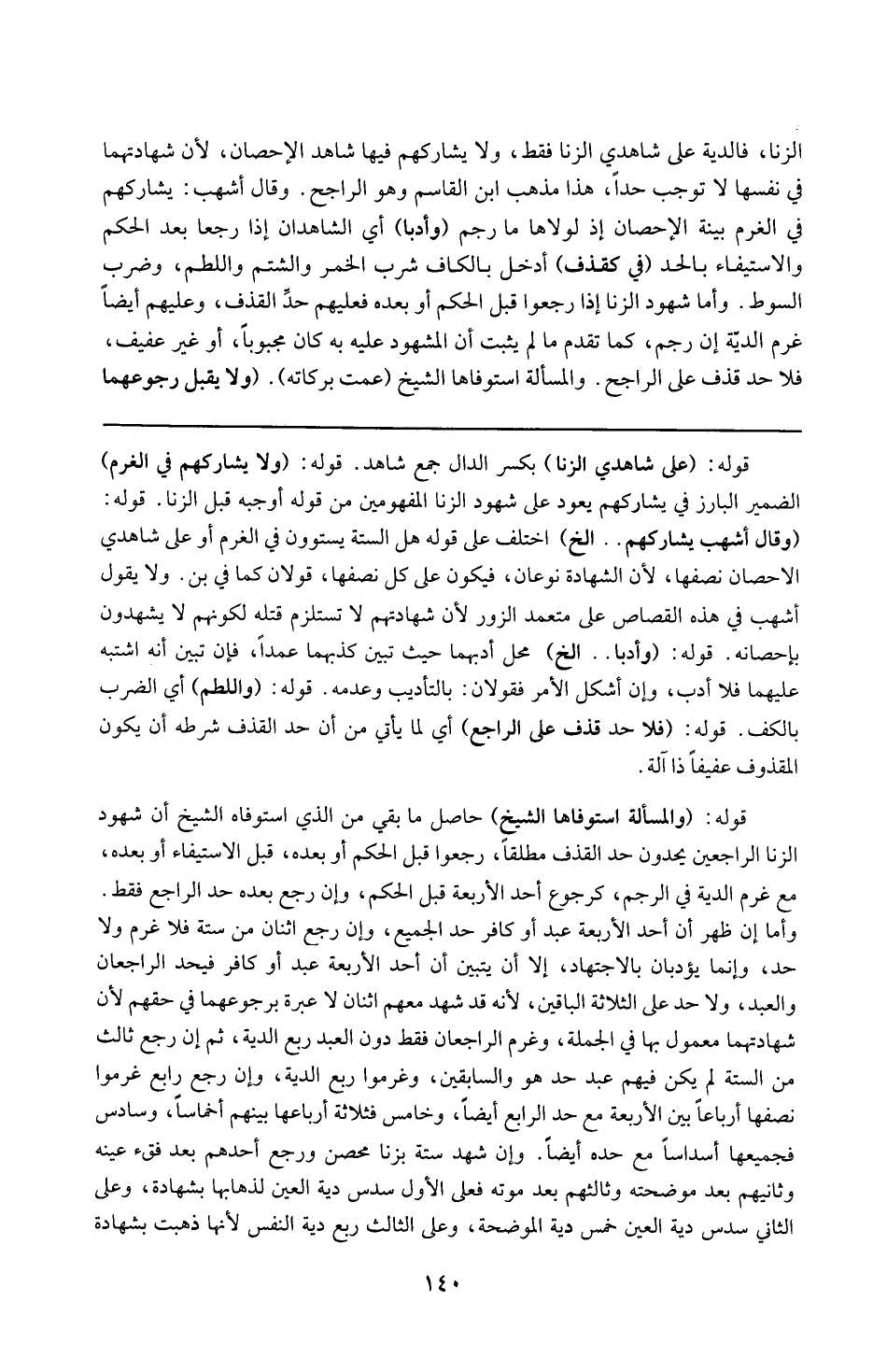 قوله : ( على شاهدي الزنا ) : بكسر الدال جمع شاهد . قوله : ( و قال أشهب يشاركهم ) إلخ : اختلف على قوله هل الستة يستوون في الغرم أم على شاهدي الإحصان نصفها لأن الشهادة نوعان فيكون على كل نصفها ، قولان كما في ( بن ) و لا يقول أشهب في هذه بالقصاص على متعمد الزور ، لأن شهادتهم لا تستلزم قتلهم لكونهم لا يشهدون بإحصانه . قوله : ( و أدبا ) إلخ : محل أدبهما حيث تبين كذبها عمدا فإن تبين أنه اشتبه عليهما فلا أدب و إن أشكل الأمر فقولان بالتأديب و عدمه . قوله : ( و اللطم ) : أي الضرب بالكف . قوله : ( فلا حد قذف على الراجع ) : أي لما يأتي من أن حد القذف شرطه أن يكون المقذوف عفيفا ذا آلة . قوله : ( و المسألة استوفاها ) الشيخ : حاصل ما بقي من الذي استوفاه الشيخ إن شهود الزنا الراجعين يحدون حد القذف مطلقا رجعوا قبل الحكم أو بعده قبل الإستيفاء أو بعده مع غرم الدية في الرجم كرجوع أحد الأربعة قبل الحكم و إن رجع بعده حد الراجع فقط وأما إن ظهر أن أحد الأربعة عبد أو كافر حد الجميع و إن رجع اثنان من ستة فلا غرم و إلا حد ، وإنما يؤدبان بالإجتهاد إلا أن يثبين أن أحد الأربعة عبد أو كافر فيحد الراجعان و العبد و لا يحد الثلاثة الباقين . لأنه قد شهد معهم اثنان و لا عبرة برجوعهما في حقهم لأن شهادتهما معمول بها في الجملة و غرم الراجعان فقط دون العبد ربع الدية ثم إن رجع ثالث من الستة ولم يكن فيهم عبد حد هو و السابقان وغرموا ربع الدية ، و إن رجع رابع غرموا نصفها أرباعا بين الأربعة مع حد الرابع أيضا و خامس فثلاثة أرباعها بينهم أخماسا و سادس فجميعها أسداسا مع حده أيضا ، و إن شهد ستة بزنا محصن و رجع أحدهم بعد فقء عينه و ثانيهم بعد موضحته و ثالثهم بعد موته ، فعلى الأول سدس دية العين لذهابها بشهادته وعلى الثاني سدس دية العين وخمس دية الموضحة وعلى الثالث ربع دية النفس لأنها ذهبت بشهادة