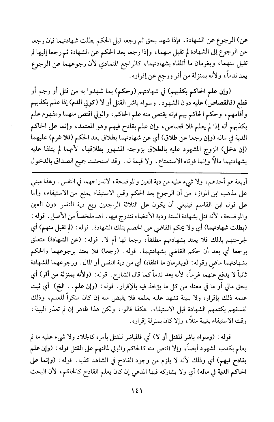 أربعة هو أحدهم ، و لا شيء عليه من دية العين و الموضحة ، لاتدراهما في النفس ، وهذا مبنى على مذهب ابن المواز أن الرجوع بعد الحكم وقبل الإستيفاء يمنع من الإستيفاء وأما على قول ابن القاسم فينبغي أن يكون على الثلاثة الراجعين ربع دية النفس دون العين والموضحة لأنه قتل بشهادة الستة و دية الأعضاء تندرج فيها ( ا هـ ملخصا من الأصل ) . ) ) 16 ( 16 ( قوله : ( بطلت شهادتهما ) : أي و لا يحكم القاضي على الخصم بتلك الشهادة . قوله : ( لم تقبل منهم ) : أي لجرحتهم بذلك فلا يعتد بشهادتهم مطلقا رجعا لها أم لا . قوله : ( رجعا ) : فلا يعتد برجوعهما و الحكم بشهادتها ماض . قوله : ( عن الشهادة ) : متعلق برجوعها أي بعد أن حكم القاضي بشهادتهما . قوله : ( و يغرمان ما أتلفاه ) : أي من دية النفس أو المال ، و رجوعهما للشهادة ثانيا لا يدفع عنهما غرما لأنه يعد ندما كما قال الشارح . قوله : ( لأنه بمنزلة من أقر ) : أي بحق مالي أو ما في معناه من كل ما يؤخذ فيه بإقرار . قوله ( و إن علم ) إلخ : أي ثبت علمه بإقراره لا ببينة تشهد عليه بعلمه فلا يقتص منه إن كان منكرا للعلم ، و ذلك لفسقهم بكتمهم الشهادة قبل الاستيفاء هكذا قالوا ، و لكن هذا ظاهر إن لم تعذر البينة وقت الاستيفاء بغيبة مثلا ، و إلا كان منزلة إقراره . قوله : ( و سواء باشر القتل أو لا ) : أي فالمباشر للقتل بأمره كالجلاد و لا شيء عليه ما لم يعلم بكذب الشهود أيضا و إلا اقتص منهم كالحاكم و الوالي لتمالئهم على القتل . قوله : ( و إن علم بقادح فيهم ) : أي وذلك لأنه لا يلزم من وجود القادح في الشاهد كذبه . قوله : ( و إنما على الحاكم الدية في ماله ) : أي و لا يشاركه فيها المدعي إن كان يعلم القادح كالحاكم ، لأن البحث