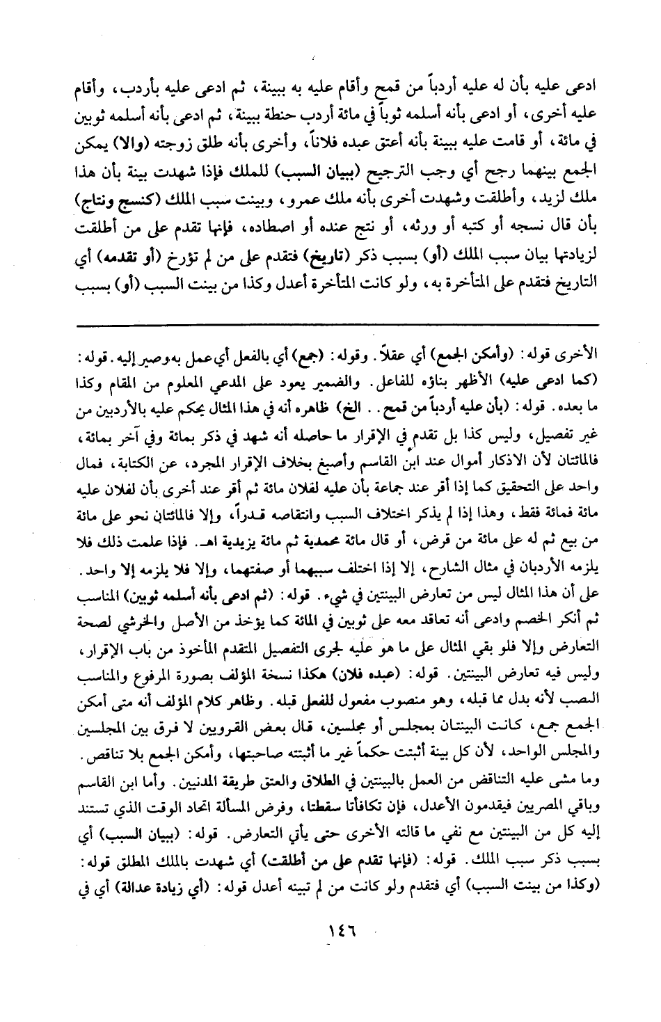 الأخرى . قوله : 16 ( و أمكن الجمع ) : أي عقلاً . ) ) 16 ( 16 ( وقوله : 16 ( جمع ) : أي بالفعل أي عمل به و صير إليه . قوله : 16 ( كما لو ادّعى عليه ) : الأظهر بناؤه للفاعل و الضمير يعود على المدعى المعلوم من المقام و كذا ما بعده . . قوله : 16 ( بأن له عليه إردباً من قمح ) الخ : ظاهره أنه في المثال يحكم عليه بالإردبين من غير تفصيل ، و ليس كذلك بل تقدم في الإقرار ما حاصله أنه إذا شهد في ذكر بمائة و في اخر بمائة فالمائتان لأن الأذكار أموال عند ابن القاسم و أصبغ . بخلاف الإقرار المجرد عن الكتابة فمال واحد على التحقيق . كما إذا أقر عند جماعة بأن عليه لفلان مائة ، ثم أقر عند أخرى بأن لفلان عليه مائة فمائة فقط و هذا إذا لم يذكر اختلاف السبب و اتفقا صفة و قدراً و إلا فالمائتان نحو له على مائة من بيع ثم له عليّ مائة من قرض أو قال مائة محمدية ، ثم يزيدية ( ا هـ ) فإذا علمت ذلك فلا يلزمه الإردبان في مثال الشارح إلا إذا اختلف سببهما أو صفتهما و إلا فلا يلزمه إلا واحد على أن هذا المثال ليس من تعارض البينتين في شيء . قوله : 16 ( ثم ادّعى بأنه أسلمه ثوبين ) : المناسب ثم أنكر الخصم و ادّعى أنه تعاقد معه على ثوبين في المائة كما يؤخذ من الأصل و الخرشي لصحة التعارض ، و إلا فلو بقي المثال على ما هو عليه لجرى على التفصيل المتقدم المأخوذ من باب الإقرار و ليس فيه تعارض البينتين . قوله : 16 ( عبده فلان ) : هكذا نسخة المؤلف بصورة المرفوع و المناسب النصب ؛ لأنه بدل مما قبله و هو منصوب مفعول للفعل قبله ، و ظاهر كلام المؤلف أنه متى أمكن الجمع جمع كانت البينتان بمجلس أو مجلسين قال بعض القرويين : لا فرق بين المجلسين و المجلس الواحد لأن كل بينة أثبتت حكماً غير ماأثبته صاحبتها و أمكن الجمع بلا تناقض ، و ما مشى عليه الشارح من العمل بالبينتين في الطلاق و العتق طريقة المدنيين . و أما ابن القاسم و باقي المصريين فيقدمون الأعدل ، فإن تكافأتا سقطتا ، و فرض المسألة اتحاد الوقت الذي تستند إليه كل من البينتين مع نفى ما قالته الأخرى حتى يأنى التعارض . قوله : 16 ( ببيان السبب ) : أي بسبب ذكر سبب الملك . قوله : 16 ( فإنها تقدم على من أطلقت ) : أي شهدت بالملك المطلق . قوله : 16 ( و كذا من بينت السبب ) : ) ) 16 ( 16 ( أي فتقدم و لو كانت من لم تبينه أعدل . قوله : 16 ( أي زيادة عدالة ) : أي في