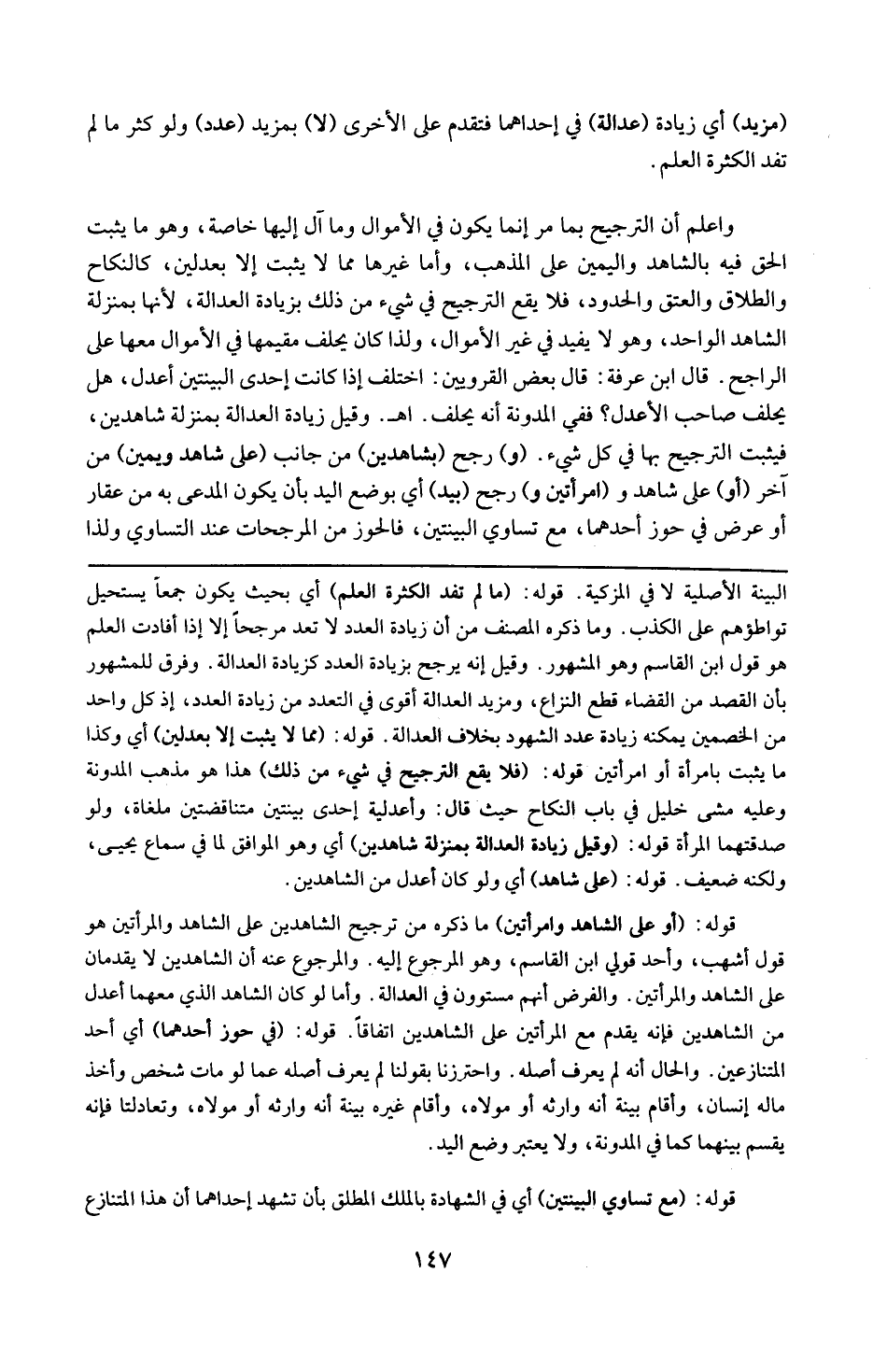 البينة الأصلية لا في المزكية . قوله : 16 ( ما لم تفد الكثرة العلم ) : أي بحيث يكون جمعاً يستحيل تواطئهم على الكذب ، و ما ذكره المصنف من أن زيادة العدد لا تعد مرجحاً إلا إذا أفادت العلم هو قول ابن القاسم وهو المشهور ، و قيل إنه يرجح بزيادة العدد كزيادة العدالة و فرق للمشور بأن القصد من القضاء قطع النزاع و مزيد العدالة أقوى في التعدد من زيادة العدد إذ كل واحد من الخصمين يمكنه زيادة عدد الشهود بخلاف العدالة . قوله : 16 ( مما لا يثبت إلا بعدلين ) : أي و كذا ما يثبت بامرأة أو امرأتين . قوله : 16 ( فلا يقع الترجيح في شيء من ذلك ) : هذا هو مذهب المدونة و عليه مشى خليل في باب النكاح حيث قال : و أعدلية إحدى بينتين متناقصتين ملغاة و لو صدقتهما المرأة . قوله : 16 ( و قيل زيادة العدالة بمنزلة شاهدين ) : أي وهو الموافق لما في سماع يحيى و لكنه ضعيف . قوله : 16 ( على شاهد ) : أي ولو كان أعدل من الشاهدين . قوله : 16 ( أو على شاهد و امرأتين ) : ما ذكره من ترجيح الشاهدين على الشاهد و المرأتين هو قول أشهب و أحد فولي ابن القاسم وهو المرجوع إليه . و المرجوع عنه أن الشاهدين لا يقدمان على الشاهدو المرأتين ، و الفرض أنهم مستوون في العدالة . و أما لو كان الشاهد الذي معهما أعدل من الشاهدين فإنه يقدم مع المرأتين على الشاهدين اتفاقاً . قوله : 16 ( في حوز أحدهما ) : أي أحد المتنازعين و الحال أنه لم يعرف أصله و احترزنا بقولنا لم يعرف أصله عما لو مات شخص و أخذ ماله إنسان و أقام بينة أنه وارثه أو مولاه و أقام غيره بينة أنه وارثه أو مولاه و تعادلنا فإنه يقسم بينهما كما في المدونة و لا يعتبر وضع اليد . قوله : 16 ( مع تساوى البينتين ) : أي في الشهادة بالملك المطلق بأن تشهد إحداهما أن هذا المتنازع