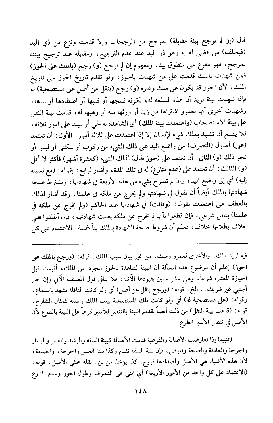 فيه لزيد ملك و الأخرى لعمرو ملك من غير بيان سبب الملك . قوله : 16 ( و رجح بالملك على الحوز ) : اعلم أن موضوع هذه المسألة أن البينة الشاهدة بالحوز المجرد عن الملك أقيمت قبل الحيازة المعتبرة شرعاً و هي عشر سنين بقيودها الآتية فلا ينافى قول المصنف الآتي و إن حاز أجنبي غير شريك الخ . ) ) 16 ( 16 ( قوله : 16 ( و رجح بنقل عن أصل ) : أي ولو كانت الناقلة تشهد بالسماع . قوله : 16 ( على مستصحبة له ) : أي ولو كانت تلك المستصحبة بينت الملك و سببه كمثال الشارح . قوله : 16 ( قدمت بينة النقل ) : من ذلك أيضاً تقديم البينة بالتنصر للأسير كرهاً على البينة بالطوع لأن الأصل في تنصر الأسير الطوع . تنبيه : إذا تعارضت الأصالة و الفرعية قدمت الأصالة كبينة السفه و الرشد و العسر و اليسار و الجرحة و العدالة و الصحة و المرض فإن بينة السفه تقدم و كذا بينة العسر و الجرحة و الصحة ؛ لأن هذه الأشياء هي الأصل و أضدادها فروع كذا يؤخذ من ( بن ) نقله محشى الأصل . قوله : 16 ( الاعتماد على كل واحد من الأمور الأربعة ) : أي التي هي التصرف و طول الحوز و عدم المنازع