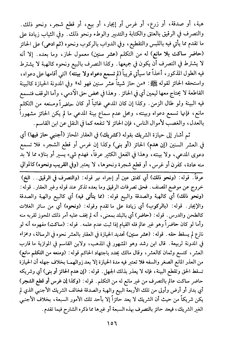 قوله : 16 ( عشر سنين ) : تحديد الحيازة في العقار بالعشر نحوه في الرسالة ، و عزاه في المدونة لربيعة ، قال ابن رشد و هو المشهور في المذهب ، و لابن القاسم في الموازية ما قارب العشر كتسع و ثمان كالعشر ، وقال مالك يحدد باجتهاد الحاكم .