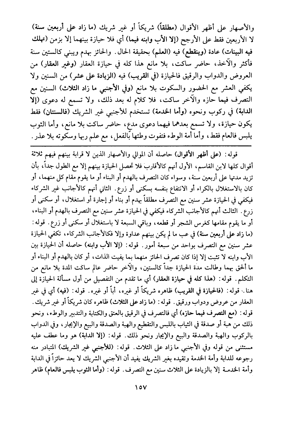 قوله : 16 ( على أظهر الأقوال ) : حاصله أن الموالي و الأصهار الذين لا قرابة بينهم فيهم ثلاثة أقوال كلها لابن القاسم ، الأول : أنهم كالأقارب فلا تحصل الحيازة بينهم إلا مع الطول جدّاً بأن تزيد مدتها على أربعين سنة ، و سواء كان التصرف بالهدم أو البناء ، أو ما يقوم مقام كل منهما ، أو كان بالاستغلال بالكراء أو الانتفاع بنفسه بسكنى أو زرع . الثاني : أنهم كالأجانب غير الشركاء فيكفي في الحيازة عشر سنين مع التصرف مطلقاً بهدم أو بناء أو إجارة أو استغلال أو سكنى أو زرع . الثالث : أنهم كالأجانب الشركاء فيكفي في الحيازة عشر سنين مع التصرف بالهدم أو البناء أو ما يقوم مقامهما كغرس الشجر أو قطعه و باقي السبعة لا بالاستغلال أو سكنى أو زرع . ) ) 16 ( 16 (