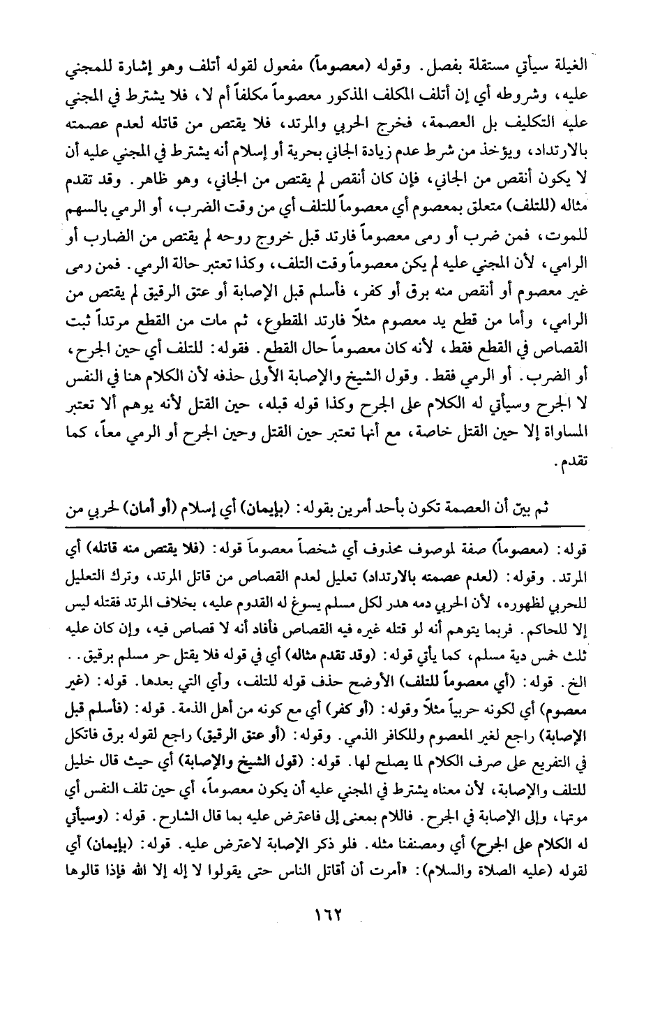 قوله : 16 ( و قول الشيخ و الإصابة ) : أي حيث قال خليل للتلف و الإصابة ، لأن معناه يشترط في المجنى عليه أن يكون معصوماً أي حين تلف النفس أي موتها ، و إلى الإصابة في الجرح فاللام بمعنى إلى فاعترض عليه بما قال الشارح .