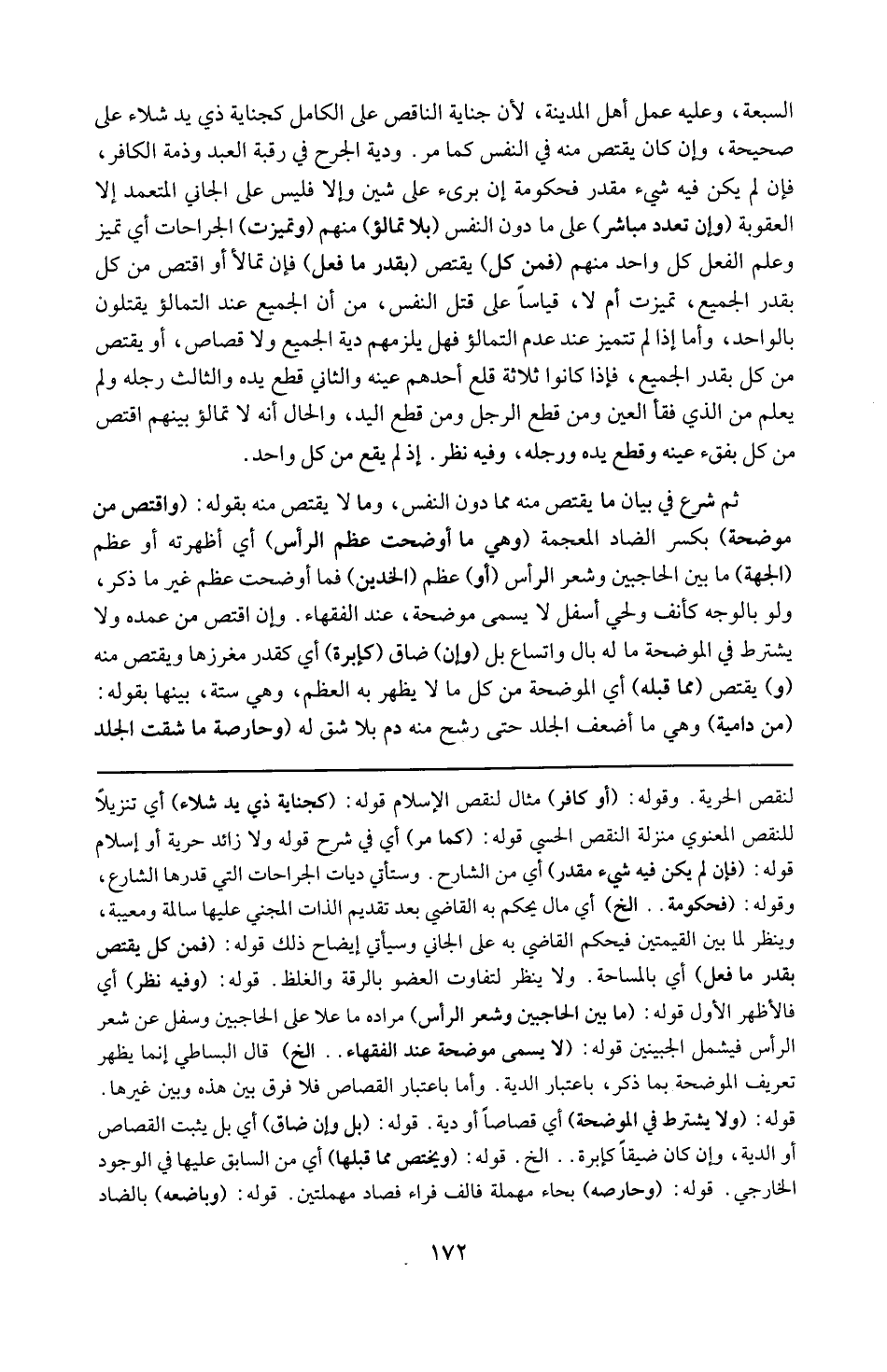 لنقص الحرية . وقوله : 16 ( أو كافر ) : مثال لنقص الإسلام . قوله : 16 ( كجناية ذى يد شلاء ) : أى تنزيلا للنقص المعنوى منزلة النقص الحسى . قوله : 16 ( كما مر ) : أى فى شرح قوله ولا زائد حرية فى الإسلام . قوله : 16 ( فإن لم يكن فيه شىء مقدر ) : أى من الشارع و ستأتى دبات الجراحات التى قدرها الشارع . وقوله : 16 ( فحكومة ) الخ : أى مال يحكم به القاضي بعد تقويم الذات المجنى عليهاسالمة ومعيبة ، وينظر لما بين القيمتين فيحكم القاي به على الجانى وسيتأتى إيضاح ذلك .