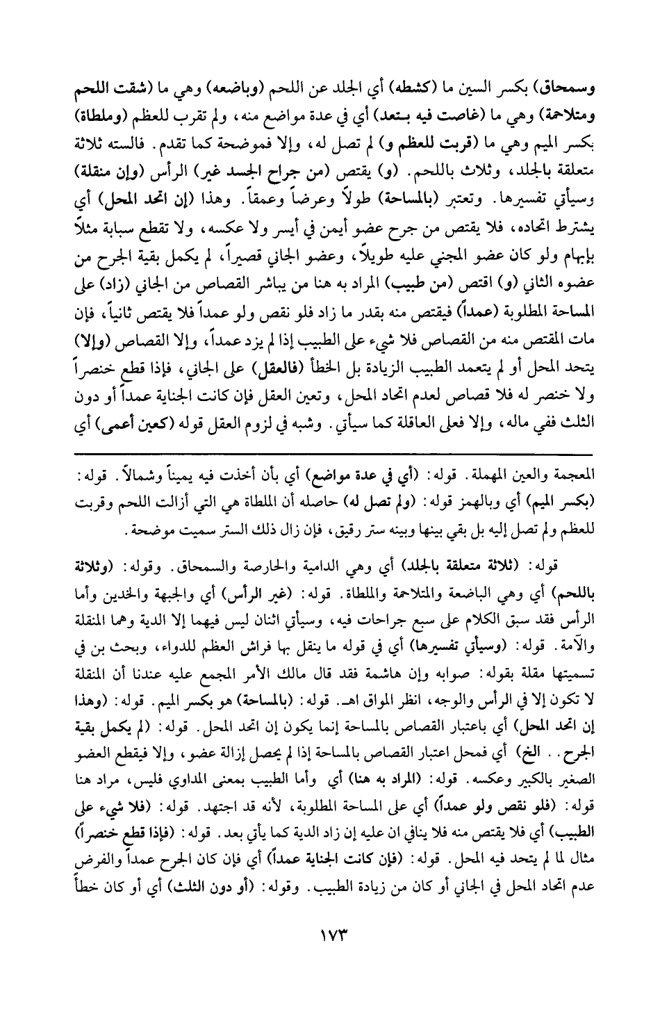 المعجمة والعين المهملة . قوله : 16 ( أى فى عدة مواضع ) : أى بأن أخذت فيه يميناً وشمالا . قوله : 16 ( بكسر الميم ) : أى وبالهمز . قوله : 16 ( ولم تصل له ) : حاصلة أن الملطأة هى التى أزالت اللحم وقربت للعظم ولم تصل إليه بل بقى بينها وبينه ستر رقيق فإن زال طلك الستر سميت موضحة . قوله : 16 ( ثلاثة متعلقة بالجلد ) : أى وهى الدامية والحارضة والسمحاق . و قوله : 16 ( وثلاثة باللحم ) : أى وهى الباضعة والمتلاحمة والملطأة . قوله : 16 ( غير الرأس ) : أى الجبهة والخدين ، وأما الرأس فقد سبق الكلام على سبع جراحات فيه ، وسيأتى اثنتان ليس فيهما إلا الدية وهما المنقلة و الآمة . قوله : 16 ( وسيأتى تفسيرها ) : أى فى قوله : ما ينقل بها فراش العظم للدواء وبحث بن فى تسميتها منقلة بقوله : صوابه : وإن هاشمة ، فقد قال مالك : الأمر المجمع عليه عندنا أن المنقلة لاتكون إلا فى الرأس والوجه . انظر المواق ( اه ) قوله : 16 ( بالمساحة ) : هى بكسر الميم . قوله : 16 ( وهذا إن اتحد المحل ) : أى واعتبار القصاص بالمساحة إنما يكون إن اتحد المحل . قوله : 16 ( لم يكمل بقية الجرح ) إلخ : أى فمحل اعتبارالقصاص بالمساحة إذا لم يحصل إزالة عضو وإلا فيقطع العضو الصغير بالكبير وعكسه . قوله : 16 ( المراد به هنا ) : أى وأما الطبيب بمعنى المداوى فليس مراداً هنا . قوله : 16 ( فلو نقص ولو عمداً ) : أى على المساحة المطلوبة لأنه قد اجتهد . قوله : 16 ( فلا شىء على الطبيب ) : أي فلا يقتص منه فلا ينافى أن عليه إن زاد الدية كما يأتى بعد . قوله : 16 ( فإذا قطع خنصراً ) : مثال لما يتحد فيه المحل . قوله : 16 ( فإن كانت الجناية عمداً ) : أى فإن كان الجرح عمداً والفرض عدم اتحاد المحل فى الجانى أو كان من زيادة الطبيب . وقوله : 16 ( أو دون الثلث ) : أى أو كان خطأ