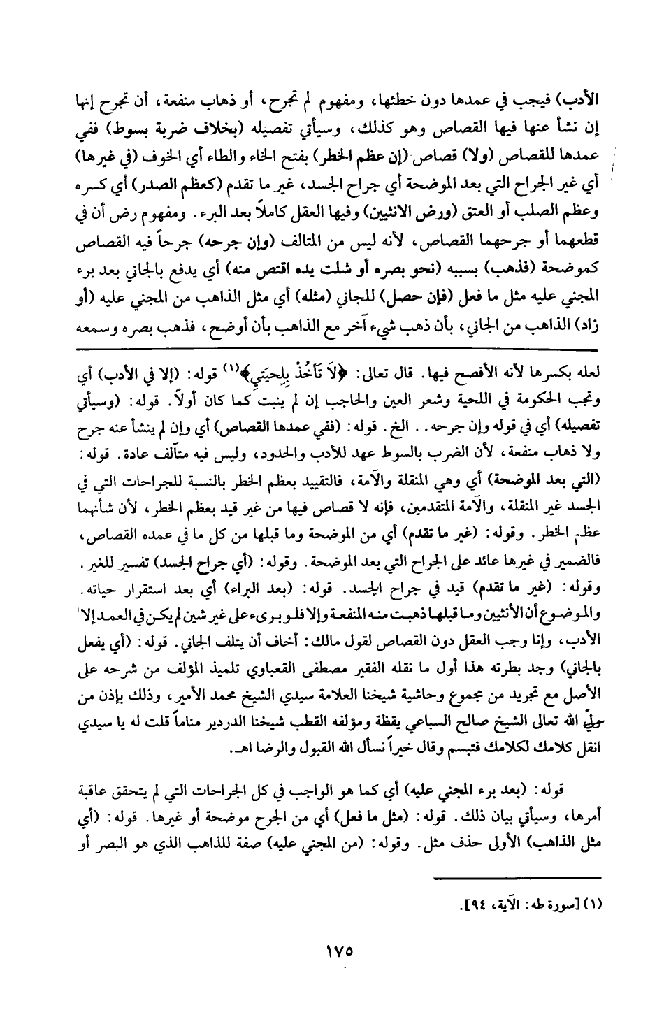 : لعله بكسرها لأنه الأفصح فيها قال تعالى : { لاتَأْخُذ بِلِحْيَتى } . قوله : 16 ( إلا في الأدب ) : أى وتجب الحكومة فى اللحية وشعر العين والحاجب إن لم ينبت كما كان أوّلا . قوله : 16 ( وسيأتى تفصيله ) : أى فى قوله وإن جرحه إلخ . قوله : 16 ( ففى عمدها القصاص ) : أى وإن لم ينشأ عنه جرح ولا ذهاب منفعة ؛ لأن الضرب بالسوط عهد للأدب والحدود ، وليس فيه متالف عادة . قوله : 16 ( التى بعد الموضحة ) : أى وهى المنقلة والآمة ؛ فالتقيد بعظم الخطر بالنسبة للجراحات التى فى الجسد غير المنقلة والآمة المتقدمين ، فأنه لاقصاص فيها من غير قيد بعظم الخطر لأن شأنهما عظم الخطر ، وقولهغير ما تقدم أى من الموضحة وما قبلها من كل ما فى عمده القصاص فالضمير فى غيرها عائد على الجرح التى بعد الموضحة . وقوله : 16 ( أى جراح الجسد ) : تفسير للغير . وقوله : 16 ( غير ما تقدم ) : قيد فى جراح الجسد . قوله : 16 ( بعد البرء ) : أى بعد استقرار حياته ، والموضوع أن الأنثيين وما قبلهما ذهبت منه المنفعة وإلا فلو برىء على غير شين لم يكن فى العمد إلا الأدب . وإنماوجب العقل دون القصاص لقوله مالك أخاف أن يتلف الجانى . قوله : 16 ( أى يفعل بالجانى ) : وجد بطرّته هدا أول مانقله الفقير مصطفى العقباوى تلميذ المؤلف من شرحه على الأصل مع تجريد من مجموعة وحاشية شيخنا العلامة سيدى الشيخ محمد الأمير ، وذلك بإذن من ولى اللّه تعالى الشيخ صالح السباعى يقظة ومؤلفه القطب شيخنا الدريدر مناماً قلت له : يا سيدى أنقل كلامك ؟ فتبسم وقال : خيراً ، نسأل اللّه القبول و الرضا . قوله : 16 ( بعد برء المجنى عليه ) : أى كما هو الواجب فى كل الجراحات التى لم يتحقق عاقبة أمرها . وسيأتى بيان ذلك . قوله : 16 ( مثل ما فعل ) : أى من الجرح موضحة أو غيرها . قوله : 16 ( أى مثل الذاهب ) : الأولى حذف مثل . وقوله : 16 ( من المجنى عليه ) صفة للذاهب الذى هو البصر أو