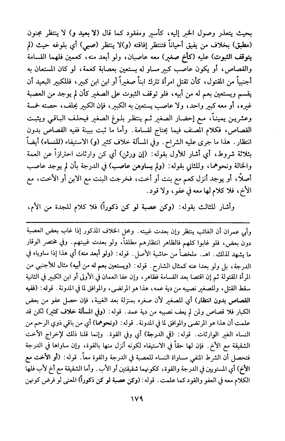 وأبي عمران : أن الغائب ينتظر و إن بعدت غيبته و محل الخلاف المذكور إذا غاب بعض العصبة دون بعض ، فلو غابوا كلهم فالظاهر انتظارهم مطلقا ، و لو بعدت غيبتهم و فى غيبتهم و فى مختصر الوقار ما يشهد لذلك قوله : 16 ( ولو أبعد منه ) : أى هذا إذا ساوياه فى الدرجة ، بل و لو بعدا عنه كمثال الشارح . قوله : 16 ( ويستعين بعم له من أبيه ) : مثال للأجنبى من المرأة المقتولة ثم إن اقتصا بعد القسامة فظاهر ، وإن عفا العمان فى الأول أو ابن الابن الكبير فى الثانية سقط القتل وللصغير نصيبه من دية عمد هذا هو المرتضى و الموافق لما فى المدونة . قوله : 16 ( ففيه القصاص بدون انتظار ) : أى للصغير لأن صغره بمنزلة بعد الغيبة ، فإن حصل عفو من بعض الكبار فلا قصاص ، و لمن لم يعف نصيبه من دية عمد . قوله : 16 ( وفى المسألة خلاف كثير ) : لكن قد علمت أن هذا هو المرتضى و الموافق لما فى المدونة . قوله : 16 ( ونحوهما ) : أى من باقى ذوى الرحم من النساء الغير الوارثات . قوله : 16 ( فى الدرجة ) : أى و فى القوة ، و إنما قلنا ذلك لإخراج الأخت الشقيقة مع الأخ للأب ، فإن لها حقًّا فى الاستيفاء لكونه أنزل منها بالقوة ، وإن ساواها فى الدرجة فتحصل أن الشرط المنفى مساواة النساء للعصبة فى الدرجة و القوة معا . قوله : 16 ( أو أخت مع الأخ ) : أى المستويين فى الدرجة و القوة ككونهما شقيقتين أو لأب فلها الكلام معه فى العفو و القود كما علمت . قوله : 16 ( وكنّ عصبة لو كن ذكورا ) : المعنى لو فرض كونهن