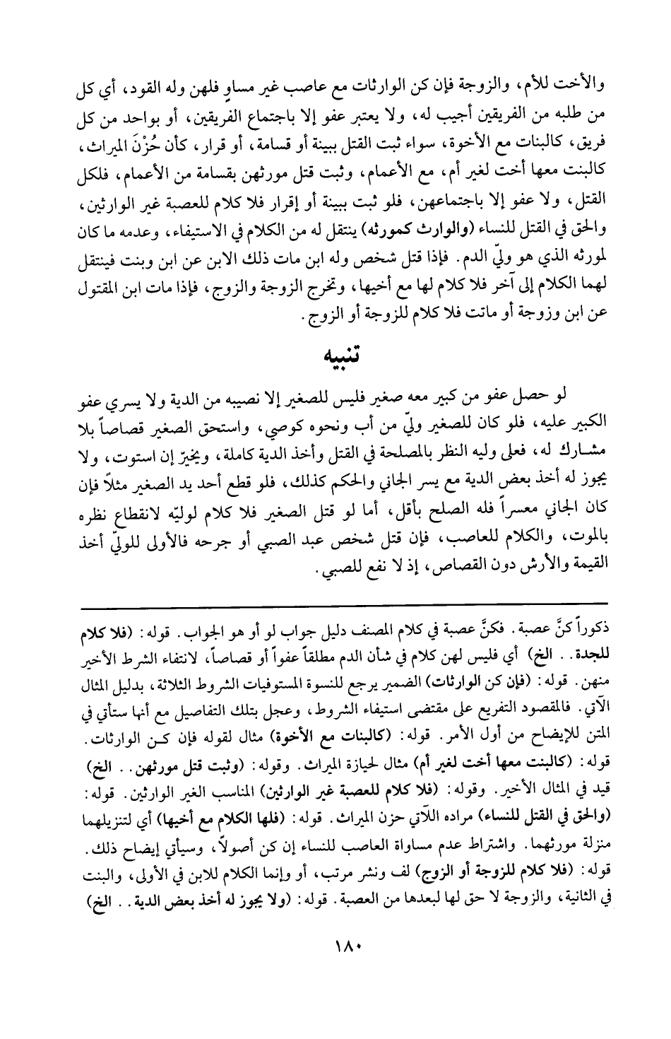 قوله : 16 ( فإن كن وارثات ) : الضمير يرجع للنسوة المستوفيات الشروط الثلاثة بدليل المثال الآتى ، فالمقصود التفريع على مقتضى استيفاء الشروط ، وعجل بتلك التفاصيل مع أنها ستأتى فى المتن للإيضاح من أول الأمر . قوله : 16 ( كالبنات مع الإخوة ) : مثال لقوله فإن كن الوارثات . قوله : 16 ( كالبنت معها أخت لغير أم ) : مثال لحيازة الميراث . وقوله : 16 ( وثيت قتل مورثهن ) إلخ : قيد فى المثال الأخير . و قوله : 16 ( فلا كلام للعصبة غير الوارثين ) : المناسب الغير الوارثين . قوله : 16 ( والحق فى قتل للنساء ) : مراده الاتى حزن الميراث . قوله : فلها الكلام مع أخيها ) : أى لتنزيلهما منزلة مورثهما ، واشترط عدم مساواة العاصب للنساء إن كن أصولا و سيأتى إيضاح ذلك . قوله : 6 ( فلا كلام للزوجة أو للزوج ) : لف ونشر مرتب ، وإنما الكلام للابن فى الأولى و البنت فى الثانية و الزوجة لا حق لها لبعدها من العصبة . قوله : 6 ( و لا يجوز له أخذ بعض الدية ) إلخ
