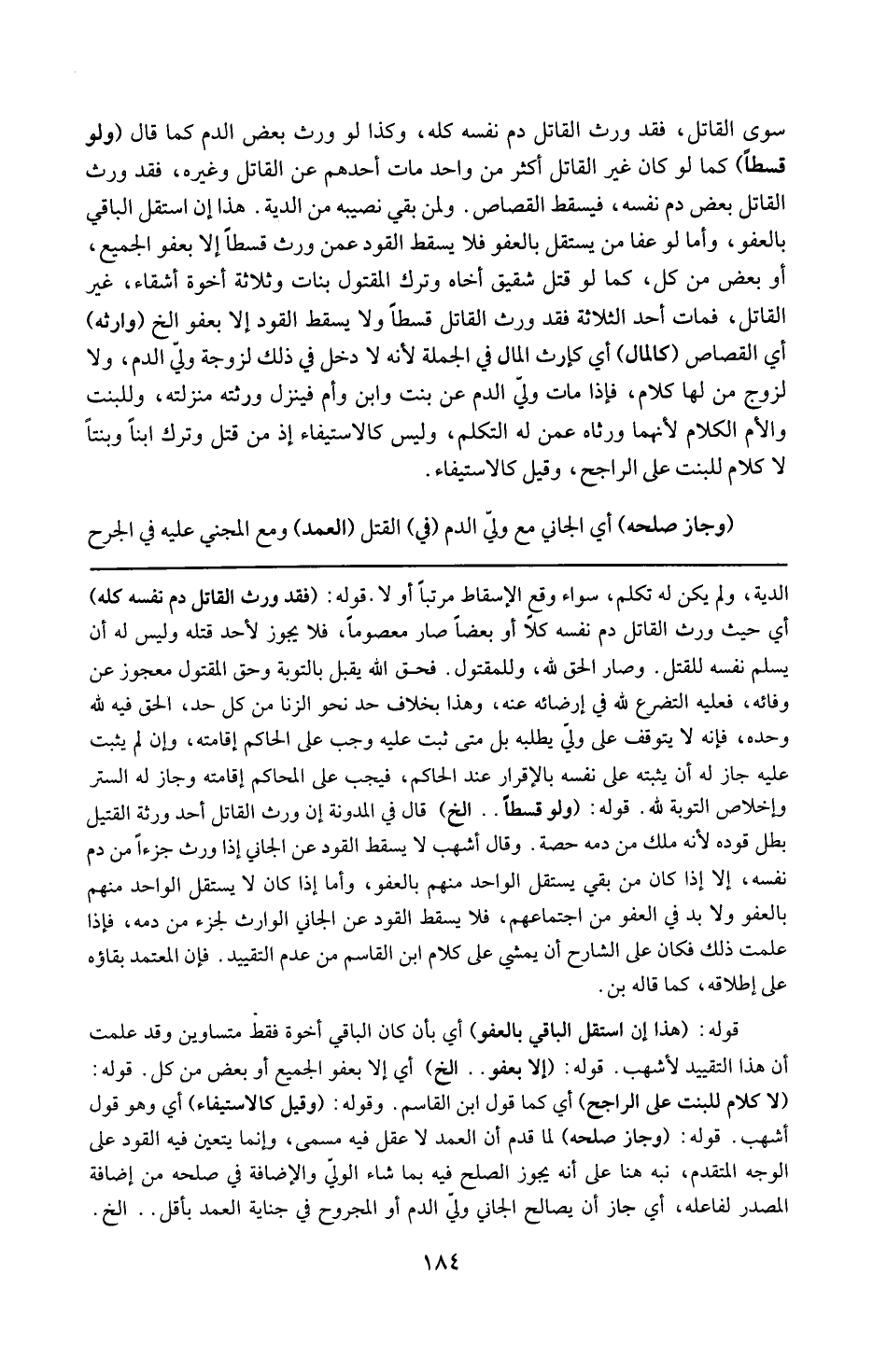 الدية و إن لم يكن له تكلم سواء وقع الإسقاط مرتبا أولا . قوله : 16 ( فقد ورث القاتل دم نفسه كله ) : أى و حيث ورث القاتل دم نفسه كلا أو بعضا صار معصوما فلا يجوز لأحد قتله ، وليس له أن يسلم نفسه للقتل و صار الحق لله و للمقتول ، فحق الله يقبل بالتوبة و حق المقتول معجوز عن وفائه فعليه التضرع لله فى إرضائه عنه و هذا بخلاف حد نحو الزنا من كل حد الحق فيه لله وحده فإنه لا يتوقف على ولّى يطلبه بل متى ثبت عليه وجب الحاكم إقامته و إن لم يثبت عليه جاز له أن يثبته على نفسه بالإقرار عند الحاكم فيجب على الحاكم إقامته و جاز له الستر و إخلاص التوبة لله . قوله : 16 ( و لو قسطا ) إلخ : قال فى المدونة : إن ورث القاتل أحد ورثة القتيل بطل قوده لأن ملك من دمه حصة ، وقال أشهب : لا يسقط القود عن الجانى إذا ورث جزءا من دم نفسه إلا إذا كان من بقى يستقل الواحد منهم بالعفو ، و أما إذا كان لا يستقل الواحد منهم بالعفو و لا بد فى العفو من اجتماعهم فلا يسقط القود عن الجانى الوارث لجزء من دمه فإذا علمت ذلك فكان على الشارح أن يمشى على كلام ابت القاسم من عدم التقييد فإن المعتمد بقاؤه على إطلاقه كما قال بن . قوله : 16 ( هذا إن استقل الباقىءخوة فقط متساوين و قد علمت أن هذا التقييد لأشهب . قوله : 6 ( ألا بعفو ) إلخ : أى إلا بعفو الجميع أو بعض من كل . قوله : لا كلام للبنت على الراجح ) : أى كما هو قول ابن القاسم قوله : 16 ( وقيل كالاستيفاء ) : أى وهو قول أشهب . قوله : 16 ( و جاز صلحه ) : لما تقدم أن العمد لا عقل فيه و إنما يتعين فيه القود على وجه المتقدم نبه هنا على أنه يجوز الصلح فيه بما شاء الولى و الإضافة فى صلحه من إضافة المصدر لفاعله ، أى جاز أن يصالح الجانى ولى الدم أو المجروح فى جناية العمد بأقل إلخ .
