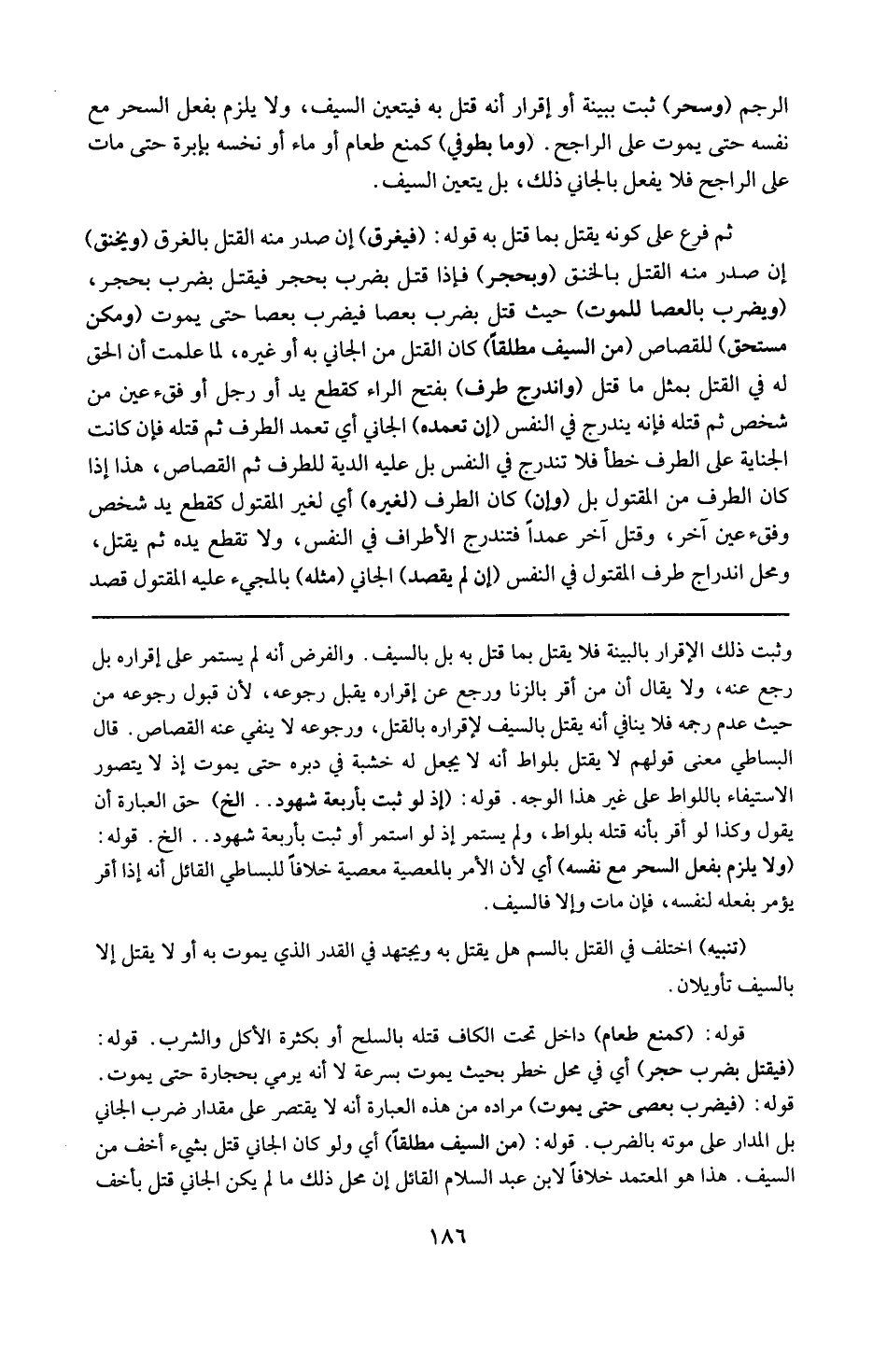 و ثبت ذلك الإقرار بالبينة فلا قتل به بل بالسيف ، و الفرض أنه لم يستمر على إقراره بل رجع عنه ، و لا يقال إن من إقر بالزنا و رجع عن إقراره يقبل رجوعه لأن قبول رجوعه من حيث عدم رجمه فلا ينافى أنه يقتل بالسيف لإقراره بالقتل و رجوعه لا ينفى عنه القصاص . قال البساطى : معنى قولهم لا يقتل بلواط أنه لا يجعل له خشبة فى دبره حتى يموت إذ لا يتصور الاستيفاء باللواط على غير هذا الوجه . قوله : 16 ( إذ لو ثبت بأربعة شهود ) إلخ : حق العبارة أن يقول و كذا لو أقر بأنه قتله بلواط و لم يستمر إذ لو استمر أو ثبت بأربعة . قوله ؛ 16 ( و لا يلزم بفعل السحر مع نفسه ) : أى لأن الأمر بالمعصية معصية خلافا للبساطى القائل إنه إذا أقر يؤمر بفعله لنفسه فإن مات و إلا فالسيف . تنبيه : اختلف فى القتل بالسم هل يقتل به و يجتهد فى القدر الذى يموت به أو لا يقتل إلا بالسيف تأويلان . قوله : 16 ( كمنع طعام ) : دخلت تحت الكاف قتله بالسلخ أو بكثرة الأكل و الشرب . قوله : 16 ( فيقتل بضرب بحجارة ) : أى فى محل خطر بحيث يموت بسرعة لا أنه يرمي بحجر حتى يموت . قوله : 16 ( فيضرب بعصى حتى يموت ) : مراده من هذه العبارة أنه لا يقتصر على مقدار ضرب الجانى بل المدار على موته بالضرب . قوله : 16 ( من السيف مطلقا ) : أى و لو كان الجانى قتل بشىء أخف من السيف هذا هو المعتمد خلافا لابن عبد السلام القائل إن محل ذلك ما لم يكن الجانى قتل بأخف