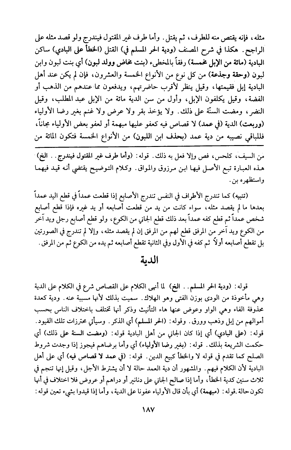 من السيف كلحس فص و إلا فعل به ذلك . قوله : 16 ( و أما طرف غير المقتول فيندرج ) إلخ : هذه العبارة تبع الأصل فيها ابن مرزوق و المواق و كلام التوضيح يقتضى أنه قيد فيهما و استظهر . تنبيه : كما تندرج الأطراف فى النفس تندرج الأصابع إذا قطعت عمدا فى قطع اليد عمدا بعدها ما لم يقصد مثله سواء كانت من يد من قطعت أصابعه أو يد غيره ، فإذا قطع أصابع شخص عمدا ثم قطع كفه عمدا بعد ذلك قطع الجانى من الكوع و لو قطع أصابع رجل و يد آخر من الكوع و يد آخر من المرفق قطع لهم من المرفق إن لم يقصد مثله و إلا لم تندرج فى الصورتين ، بل تقطع أصابعه أوّلا ثم كفه فى الأولى ، و فى الثانية تقطع أصابعه ثم يده من الكوع ثم من المرفق . قوله : 16 ( و دية الحر المسلم ) إلخ : لما أنهى الكلام على القصاص شرع فى الكلام على الدية و هى مأخوذة من الودى بوزن الفتى و هو الهلاك سميت بذلك لأنها مسببة عنه و دية كعدة محذوفة الفاء و هى الواو و عوّض عنها هاء التأنيث و ذكر أنها تختلف اختلاف الناس بحسب أموالهم من إبل و ذهب و ورق و قوله الحر المسلم أى الذكر و سيأتى محترزات تلك القيود . قوله : على البادى ) : أى إذا كان الجانى من أهل البادية . قوله : 6 ( و مضت السنة على ذلك ) : أى حكمت الشريعة بذلك . قوله : 6 ( بغير رضا الأولياء ) : أى و أما برضاهم فيجوز إذا وجدت شروط الصلح كما تقدم فى قوله و الخطأ كبيع الدين . قوله : 6 ( فى عمد لا قصاص فيه ) : أى على أهل البادية لأن الكلام فيهم و المشهور أن دية العمد حالة إلا أن يشترط الأجل ، و قيل : إنها تنجم فى ثلاث سنين كدية الخطأ ، و أما إذا صالح الجانى على دنانير أو دراهم أو عروض فلا اختلاف فى أنها تكون حالة . قوله : 6 ( مبهمة ) : أى بأن قال الأولياء عفونا على الدية ، و أما إذا قيدوا بشىء تعين . قوله