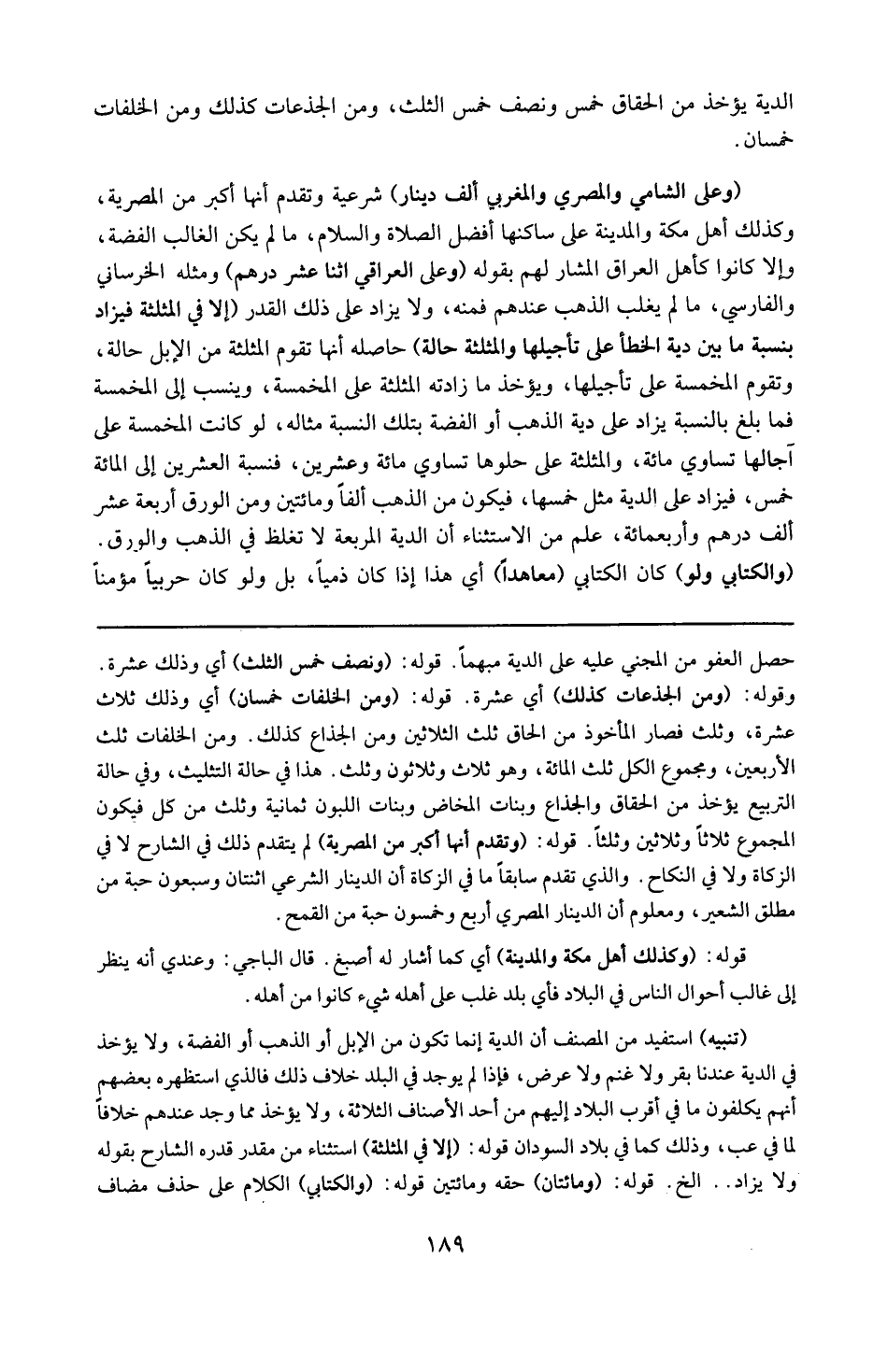 حصل العفو من المجنى عليه على الدية مبهما . قوله : 16 ( خمس و نصف خمس الثلث ) : أى و ذلك عشرة . و قوله : 16 ( و من الجذعات ) : أى عشرة . قوله : 16 ( و من الخلفات خمسان ) : أى و ذلك عشرة و ثلث فصار المأخوذ من الحقان ثلث الثلاثين ، و من الجذاع كذلك و من الخلفات ثلث الأربعين و مجموع الكل ثلث المائة و هو ثلاث و ثلاثون و ثلث هذا فى حالة التثليث و فى حالة التربيع يؤخذ من الحقائق و الجذاع و بنات المخاض و بنات اللبون ثمانية و ثلث من كل فيكون المجموع ثلاثا و ثلاثين و ثلثا . قوله : 16 ( و تقدم أنها أكبر من المصرية ) : لم يتقدم ذلك فى الشارح لا فى الزكاة و لا فى النكاح و الذى تقدم سابقا ما فى الزكاة أن الدينار الشرعى اثنتان و سبعون حبة من مطلق الشعير و معلوم أن الدينار المصرى أربع و خمسون حبة من القمح . قوله : 16 ( و كذلك أهل مكة و المدينة ) : أى كما أشار له أصبغ قال الباجى و عندى أنه ينظر إلى غالب أحوال الناس فى البلاد ، فأى بلد غلب على أهله شىء كانوا من أهله . تنبيه : استفيد من المصنف أن الدية إنما تكون من الإبل أو الذهب أو الفضة و لا يؤخذ فى الدية عندنا بقر و لا غنم و لا عرض ، فإذا لم يوجد فى البلد خلاف ذلك فالذى استظهره بعضهم أنهم يكلفون ما فى أقرب البلاد إليهم من أحد الأصناف الثلاثة و لا يؤخذ مما وجد عندهم خلافا لما فى عب و ذلك كما فى بلاد السودان . قوله : 16 ( إلا فى المثلثة ) : استثناء من مقدر قدره الشارح بقوله و لا يزاد إلخ . قوله : 16 ( و مئتان ) : حقه و مائتين . قوله : 16 ( و الكتابى ) : الكلام على حذف مضاف
