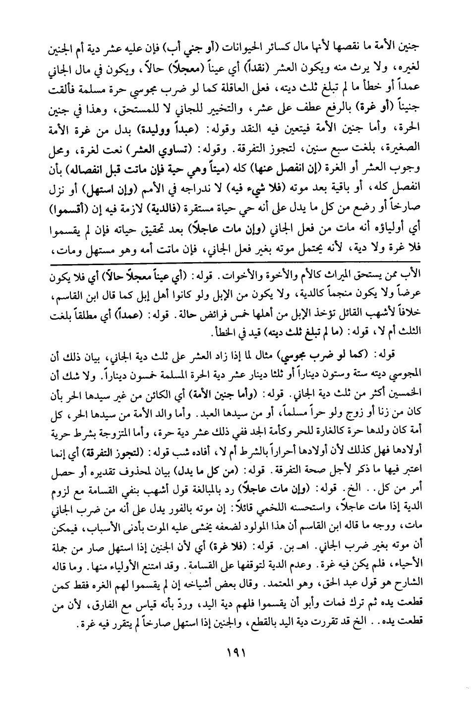 الأب ممن يستحق الميراث كالأم و الإخوة و الأخوات . قوله : 16 ( أى عينا معجلا حالا ) : أى فلا يكون عرضا و لا يكون منجما كالدية و لا يكون من الإبل و لو كانوا أهل إبل كما قال ابن القاسم خلافا لأشهب القائل تؤخذ الإبل من أهلها خمس فرائض حالة . قوله : 16 ( عمدا ) : أى مطلقا بلغت الثلث أم لا . قوله : 16 ( ما لم تبلغ ثلث ديته ) : قيد فى الخطأ . قوله : 16 ( كما لو ضرب مجوسى ) : مثال لما زاد العشر على ثلث دية الجانى بيان أن المجوسى ديته ستة و ستون دينارا و ثلثا دينار ، و عشر دية الحرة المسلمة خمسون دينارا ، و لا شك أن الخمسين أكثر من ثلث دية الجانى . قوله : 16 ( و أما جنين الأمة ) : أى الكائن من غير سيدها الحر بأن كان من زنا أو زوج و لو حرًّا مسلما أو من سيدها العبد . و أما ولد الاْمة من سيدها الحر كل أمة كان ولدها حرًّا كالغارّة للحر و كأمة الحد ففى ذلك عشر دية حرة . و أما المتزوجة بشرط حرية أولادها فهل كذلك لأن أولادها أحرار بالشرط أم لا ؟ أفاده شب . قوله : 16 ( لتجوز التفرقة ) : أى إنما اعتبر فيها ما ذكر لأجل صحة التفرقة . قوله : 16 ( من كل ما يدل ) : بيان لمحذوف تقديره أو حصل أمر من كل إلخ . قوله : 16 ( و أن مات عاجلا ) : رد بالمبالغة قول أشهب بنفى القسامة مع لزوم الدية إذا مات عاجلا و استحسنه اللخمى قائلا : أن موته بالفور يدل على أنه من ضرب الجانى مات ، و وجه ما قال ابن القاسم أن هذا المولود لضعفه يخشى عليه الموت بأدنى الأسباب فيمكن أن موته بغير ضرب الجانى . قوله : 16 ( فلا غرة ) : أى لأن الجنين إذا استهل صار من جملة الأحياء فلم يكن فيه غرة و عدم الدية لتوقفها على القسامة ، و قد امتنع الأولياء منها ، و ما قاله الشارح هو قول عبد الحق و هو المعتمد و قال بعض أشياخه إن لم يقسموا لهم الغرة فقط كمن قطعت يده ثم ترك فمات و أبوا أن يقسموا فلهم دية اليد ، و ردّ لأنه قياس مع الفارق لأن من قطعت يده إلخ قد تقررت دية اليد بالقطع و الجنين إذا استهل صارخا لم يتقرر فيه غرة
