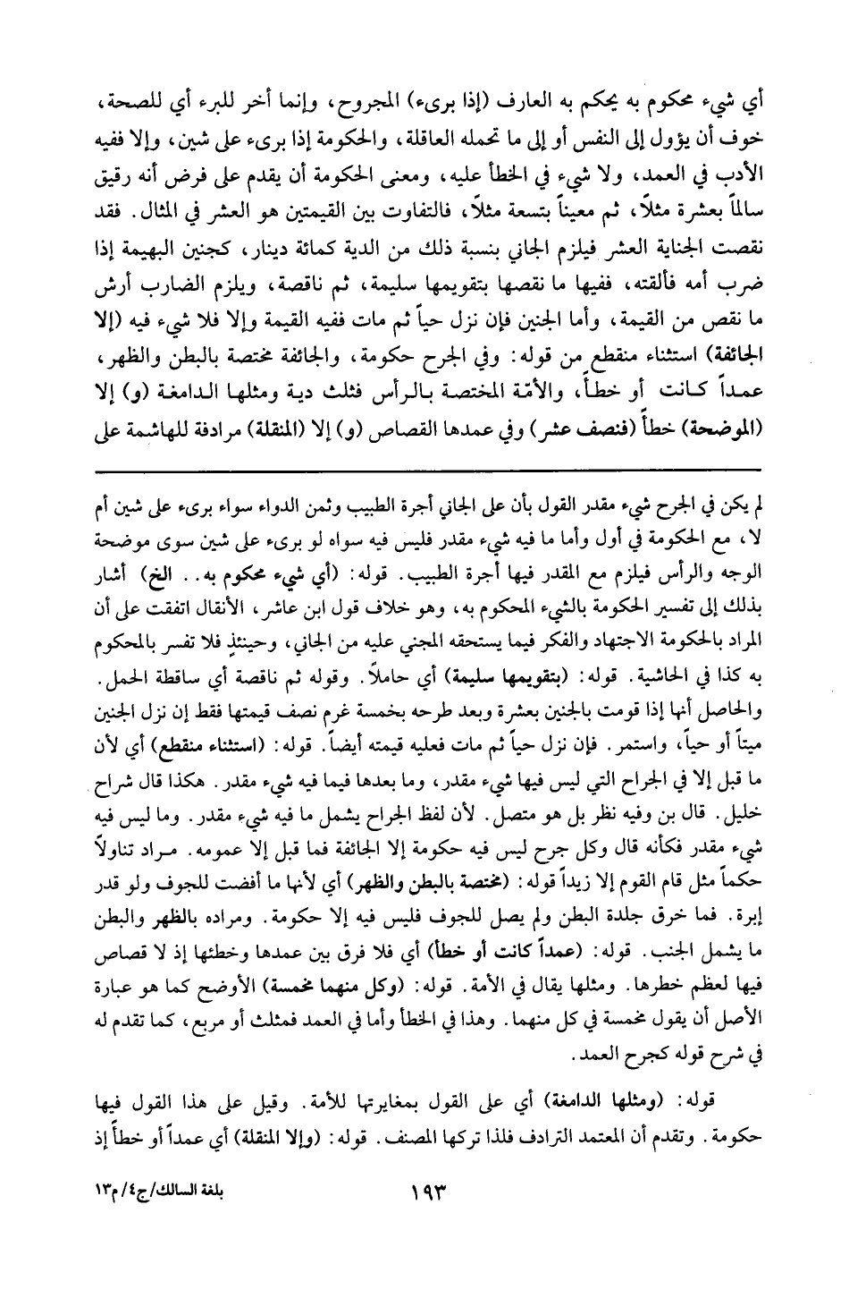 لم يكن فى الجرح شىء مقدر القول بأن الجانى أجرة الطبيب و ثمن الدواء سواء برىء على شين أم لا مع حكومة فى الأول ، و أما ما فيه شىء مقدر فليس فيه سواه و لو برىء على سين سوى موضحة الوجه و الرأس فيلزم مع المقدر فيها أجرة الطبيب . قوله : 16 ( أى شىء محكوم به ) إلخ : أشار بذلك إلى تفسير الحكومة بالشىء المحكوم به و هو خلاف قول ابن عاشر الأنقال اتفقت على أن المراد بالحكومة الاجتهاد و إعمال الفكر فيما يستحق المجنى عليه من الجانى و حينئذ فلا تفسر بالمحكوم به كذا فى الحاشية . قوله : 16 ( بتقويمها سليمة ) : أى حاملا . قوله : 16 ( ثم ناقصة ) : أى ساقطة الحمل . و الحاصل أنها إذا قومت بالجنين بعشرة و بعد طرحه بخمسة غرم نصف قيمتها فقط أن نزل الجنين ميتا أو حيا و استمر ، فإن نزل حيًّا ثم مات فعليه قيمته أيضا . قوله : 16 ( استثناء منقطع ) : أى لأن ما قبل إلا فى الجراح التى ليس فيها شىء مقدر و ما بعدها فيما فيه شىء مقدر هذا قال شراح خليل قال و فبه نظر بل هو متصل لأن لفظ الجراح يشمل ما فيه شىء مقدر و ما ليس فيه شىء مقدر فكأنه قال و كل جرح فيه حكومة إلا الجائفة فما قبل إلا عمومه مراد تناولاً لا حكما مثل قام القوم ألا زيدا . قوله : 16 ( مختصة بالبطن و الظهر ) : أى لأنها ما أفضت إلى الجوف و لو قدر إبرة فما خرق جلدة البطن و لم يصل للجوف فليس فيه إلا حكومة و مراده بالظهر و البطن ما يشمل الجنب . قوله : 16 ( عمدا كانت أو خطأ ) : أى فلا فرق بين عمدها أو خطئها إذ لا قصاص فيها لعظم خطرها و مثلها يقال فى الآمة . قوله : 16 ( و كل منهما مخمسة ) : الأوضح كما هو عبارة الإصل أن يقول مخمسة فى كل منهما و هذا فى خطأ . و أما فى العمد فمثلث أو مربع كما تقدم له فى الشرح قوله كجرح العمد . قوله : 16 ( و مثلهاالدامغة ) : أى على القول بمغايرتها للأمة و قيل على هذا القول فيها حكومة و تقدم أن المعتمد الترادف فلذا تركها المصنف . قوله : 16 ( و إلا المنقلة ) : أى عمدا أو خطأ إذ