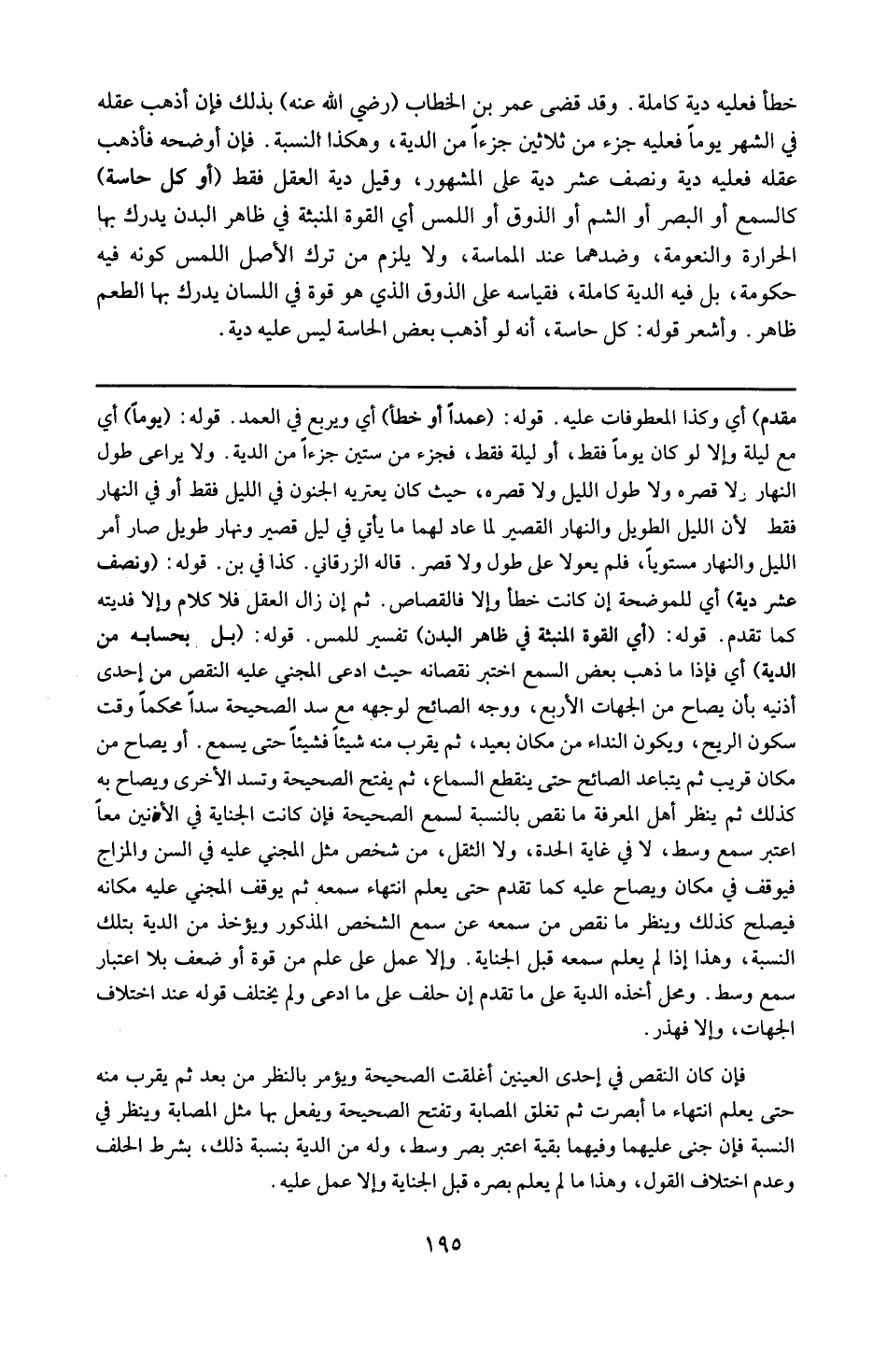 مقدم ) : أى و كذا المعطوفات عليه . قوله : 6 ( عمدا أو خطأ ) : أى و تربع فى العمد . قوله : 6 ( يوما ) أى مع ليلة و إلا لو كان مع ليلة و إلا لو كان يوما فقط أو ليلة فقط فجزء من ستين جزءا من الدية و لا يراعى طول النهار و لا قصره ، و لا طول الليل و لا قصره ، حيث كان يعتريه الجنون فى الليل فقط أو فى النهار فقط ؛ لأن الليل الطويل و النهار القصير لما عاد لهما ما يأتى فى ليل قصير و نهار طويل صار أمر الليل و النهار مستويا فلم يعولوا على طول و لا قصر قاله : الزرقانى كذا فى بن . قوله : 6 ( و نصف عشر دية ) : أى للموضحة إن كانت خطأ و إلا فالقصاص ثم إن زال العقل فلا كلام و إلا فالديته كما تقدم . قوله : 6 ( أى القوة المنبثة فى ظاهر البدن ) : تفسبرللمس . قوله : 6 ( من ترك الأصل ) : فقياسه على الذوق ) : أى لأنّ شراح خليل ذكروا أنه مقيس عليه . قوله : 16 ( بل بحسابه من الدية ) : أى فإذا أذهب بعض السمع اختبر نقصانه حيث ادعى المجنى عليه النقص من احدى أذنيه بأن يصاح من الجهات الأربع و وجه الصائح لوجه مع سدّ الصحيحة سًّدا محكما وقت سكون الريح ، و يكون النداء من مكان بعيد ثم يقرب منه شيئا فشيئا حتى يسمع ، أو يصاح من مكان قريب ثم يتباعد الصائح حتى ينقطع السماع ثم تفتح الصحيحة و تسد الأخرى و يصاح به كذلك ، ثم ينظر أهل المعرفة ما نقص بالنسبة لسمع الصحيحة ، فإن كانت الجناية فى الأذنين معا اعتبر سمع وسط لا فى غاية الحدة و لا الثقل من شخص مثل المجنى عليه فى السن و المزاج فيوقف فى مكان و يصاح عليه كما تقدم حتى يعلم انتهاء سمعه ثم يوقف المجنى عليه مكانه فيصاح عليه كذلك و ينظر ما نقص من سمعه عن سمع الشخص المذكور و يؤخذ من الدية بتلك النسبة ، و هكذا إذا لو يعلم سمعه فبل الجناية و إلا عمل على علم من قوة أو ضعف بلا اعتبار سمع وسط و محل أخذه الدية على ما تقدم إن حلف على ما ادعى و لم يختلف قوله عند اختلاف الجهات و إلا فهدر ، فإن كان النقص فى إحدى العينين أغلقت الصحيحة و يؤمر بالنظر من بعد ثم يقرب منه حتى يعلم انتهاء ما أبصرت ثم تغلق المصابة و تفتح الصحيحة و يفعل بها مثل المصابة و ينظر فى النسبة ، فإن جنى عليهما و فيهما بقية اعتبر بصر وسط و له من الدية بنسبة ذلك بشرط الحلف و عدم اختلاف القول ، و هذا ما لم يعلم بصره فبل الجناية و إلا عمل عليه