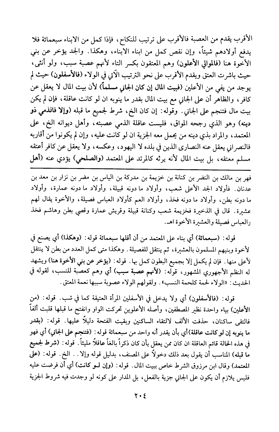 فهر بن مالك بن النضر بن كنانة ابن خزيمة بن مدركة بن الياس بن مضر ابن نزار بن معدّ بن عدنان ، فأولادالجد الأعلى شعب ، و أولاد ما دونه قبيلة ، و أولاد ما دونه عمارة ، و أولاد ما دونه بطن ، أولاد فخذ ، أولاد مادونه العم كأولاد العباس فصيلة و الإخوة يقال لهم عشيرة ، قال فى الذخيرة : فخزيمة شعب و كنانة قبيلة و قريش عمارة و قصى بطن و هاشم فخذ و العباس فصيلة و العشيرة الإخوة . قوله : 16 ( سبعمائة ) : أى بناء على المعتد من أن أقلها سبعمائة . قوله : 16 ( و هكذا ) : أى يصنع فى الإخوة و بنيهم المسمون بالعشيرة ، ثم ينتقل للفصيلة و هكذا ، فمتى كمل العدد من بطن لا ينتقل لأعلى منها ، فإن لم يكمل إلا بجميع البطون كمل بها . قوله : 16 ( يؤخر عن بنى الإخوة هنا ) : و يشهد له نظم الأجهوري المشهور . قوله : 16 ( لأنهم عصبة سبب ) : أى و هم كعصبة النسب لقوله فى الحديث : ( الولاء لحمة كلحمة النسب ) و لقولهم : الولاء عصوبة سببها نعمة المعتق . قوله : 16 ( فالأسفلون ) : أى و لا يدخل فى الأسفلين المرأة العتيقة كما فى شب . قوله : 16 ( من الأعلين ) : بياء واحدة نظير المصطفين ، و أصله الأعلون تحركت الواو و انفتح ما قبلها قلبت ألفا فالتقى ساكنان حذفت الألف لالتقاء الساكنين و بقيت الفتحة دليلا عليها . ) ) ) ) ) ) 16 ( 16 ( 16 ( 16 ( 16 ( 16 ( قوله : 16 ( بقدر ما ينوبه أن او لكانت عاقلة ) : أى بأن يقدر أنه واحد من سبعمائة . قوله : 16 ( فتنجم على الجانى ) : أى فهو فى هذه الحالة قائم مقام العاقلة أن كان ممن يعقل إن كان ذكرا بالغر عاقلا مليئا . قوله : 16 ( شرط لجميع ما قبله ) : الناسب أن يقول بعد ذلك دخولا على المصنف بدليل قوله و إلا إلخ . قوله : 16 ( على المعتمد ) : و قال ابن مرزوق الشرط خاص ببيت المال . قوله : أن لو كانت ) : أى أن لو فرضت عليه فليس بلازم أن يكون على الجانى جزية بالفعل ، بل المدار على كونه لو وجدت فيه شروط الجزية