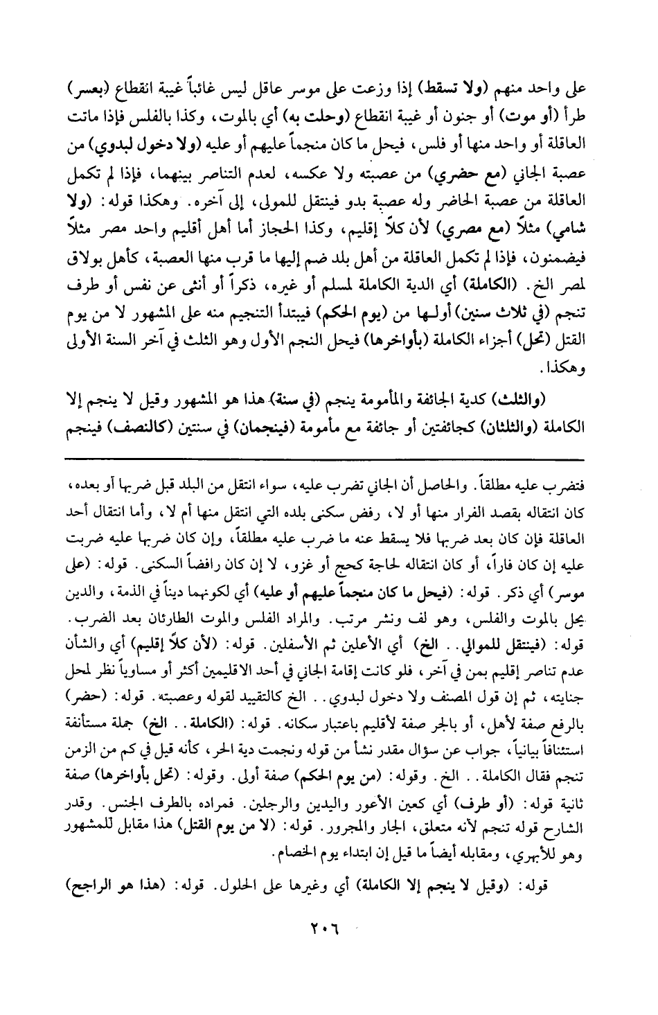 فتضرب عليه مطلقر . و الحاصل أن الجانى تضرب عليه سواء انتقل من البلد قبل ضربها أو بعده كان انتقاله بقصد الفرار منه أولا ، رفض سكنى بلده الذى منه انتقل منها أم لا ، و أما انتقال أحد العاقلة فإن كان بعد ضربها فلا يسقط عنه ما ضرب عليه مطلقا و إن كان قبل ضربها عليه ضربت عليه أن كان قارا أو كان انتقاله لحاجة كحج أو غزو لا إن كان رافضا السكنى . قوله : 16 ( على موسر ) : أى على ذكر . قوله : ) فيحل ما كان منجما عليهم أو عليه ) : أى لكونهما دينا فى الذمة و الدين يحل بالموت و الفلس و هو لف و نشر مرتب ، و المراد الفلس و الموت الطاريان بعد الضرب . قوله : 16 ( فينتقل للموالى ) إلخ : أى الأعلين ثم الأسفلين . قوله : 16 ( لأن كل إقليم ) : أى و الشأن عدم تناصر إقليم بمن فى آخر ، فلو كانت إقامة الجانى فى أحد الإقليمين أكثر أو مساويا نظر لمحل جنايته ، ثم إن قول المصنف و لا دخول ابدوى إلخ كالتقيد لقوله و عصبته . قوله : 16 ( حضر ) : بالرفع صفة لأهل أو بالجر صفة لأقليم باعتبار سكانه . قوله : 16 ( الكانلة ) إلخ : جملة مستأنفة استئنافا بيانيًّا جواب عن سؤال مقدر نشأ من قوله : و نجمت دية الحر ، كأنه قيل فى كم من الزمن تنجم فقال : الكاملة إلخ . قوله : 16 ( من يوم الحكم ) : صفة أولى . قوله : 16 ( أو طرف ) : أى كعين الأعور و اليدين و الرجلين فمراده بالطرف الجنس و قدر الشارح قوله : تنجم لأنه متعلق الجار و المجرور . قوله : 16 ( لا من يوم القتل ) : هذا مقابل للمشهور و هو للأبهري و مقابلة أيضا ما قيل إن ابتداه بوم الخصام . و قوله : 16 ( تحل بأواخرها ) : صفة ثانية . قوله : 16 ( و قيل لا ينجم إلا الكاملة ) : أى و غيرها على الحلول . قوله : 16 ( هذا هو الراجح )
