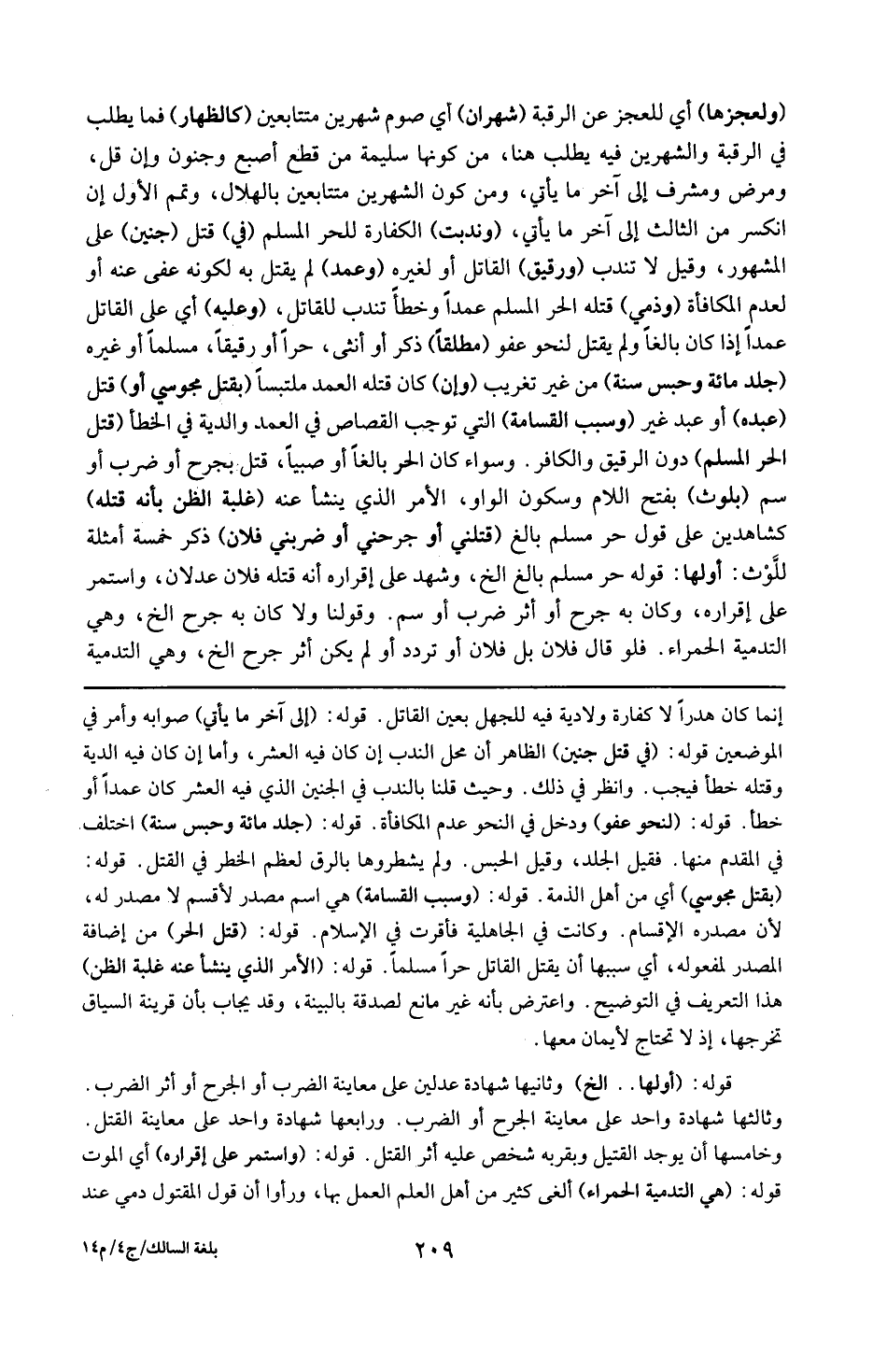 ) : إنما كان هدرا لا كفارة و لا دية فيه للجهل بعين القاتل . قوله : 6 ( إلى آخر ما يأتى ) : صوابه ما مرّ فى الموضعين . قوله : 6 ( فى قتل جنين ) : الظاهر أن محل الندب إن كان فيه العشر ، و أما كان فيه الدية و قتله خطأ فيجب و انظر فى ذلك و حيث قلنا بالندب فى الجنين الذى فيه العشر كان عمدا أو خطأ . ) ) ) 16 ( 16 ( 16 ( قوله : 6 ( لنحو عفو ) : دخل فى النحو عدم المكافأة . قوله : 6 ( جلد مائة و حبس سنة ) : اختلف فى المقدم منها فقيل الجلد ، و قيل الحبس و لم يشطروها بالرق لعظم الخطر فى القتل . قوله : 6 ( بقتل مجوسى ) : أى من أهل الذمة . قوله : ظ و سبب القسامة ) : هى اسم مصدر لا قسم لا مصدر له لأن مصدره الإقسام ، و كانت فى الجاهلية فأقرت فى الإسلام . قوله : 16 ( قتل الحر ) : من إضافة المصدر لمفعوله أى سببها أن يقتل حرًّا مساما . قوله : 16 ( الأمر الذى ينشأ عنه غلبة الظن ) : هذا التعريف فى التوضيح و اعترض بأنه غير مانع لصدقه بالسنة ، و قد يجاب بأن قرينة السياق تخرجها إذ لا تحتاج لأيمان معها . قوله : 16 ( أولها ) إلخ : و ثانيها شهادة عدلين على المعاينة الضرب أو الجرح أو أثر الضرب . و رابعها شهادة واحد على معاينة القتل . و خامسها أن يوجد القتيل و بقربه شخص عليه أثر القتل . قوله : 16 ( و الشهر على إقراره ) : أى إألى الموت . قوله : 16 ( هى التدمية الحمراء ) : ألغى كثير من أهل العلم العمل بها و رأوا أن قول المقتول دمى عند