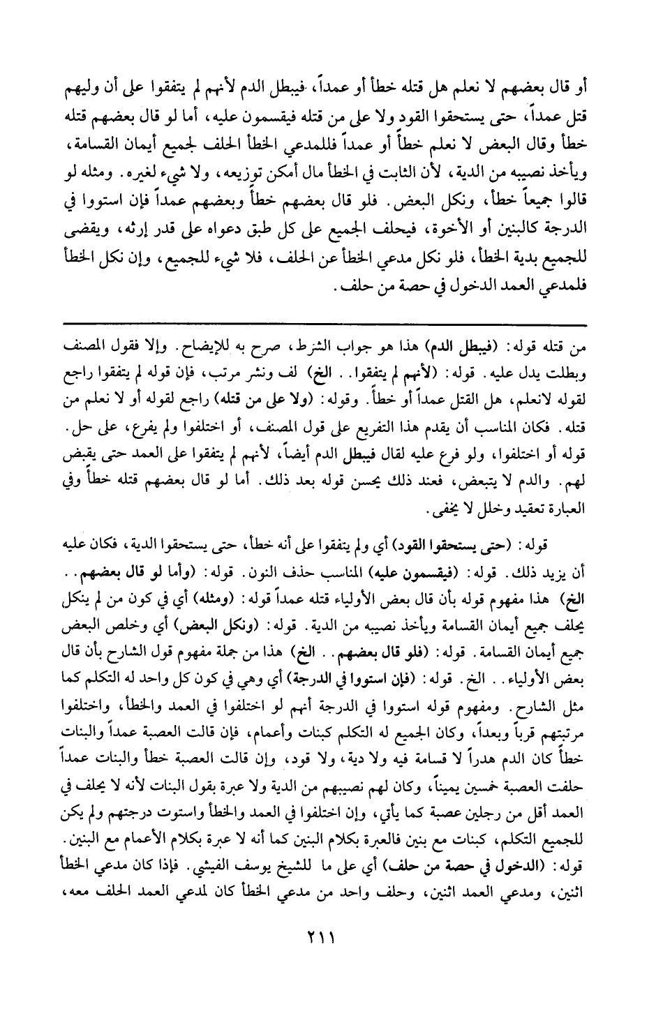 من قتله . قوله : 16 ( فيبطل الدم ) ؛ هذا هة جواب الشرط صرح به للإيضاح و إلا فقول المصنف و بطلت يدل عليه . قوله : 16 ( لأنهم لم يتفقوا ) : إلخ ؛ لف و نشر مرتب ، فإنّ قوله لم يتفقوا راجع لقوله لا نعلم هل القتل عمدا أو خطأ . قوله : 16 ( حتى يستحقوا القود ) : أى و لم يتفقوا على أنه خطأ حتى يستحقوا الدية فكان عليه أن يزيد ذلك . قوله : 16 ( و لا على من قتله راجع لقوله أو لا نعلم من قتله فكان المناسب أن يقدم هذا التفريع على قول المصتف ، أو اختلفوا و لم يفرع على حل قوله أو اختلفوا و لو فرع عليه لقال فيبطل الدم أيضا ؛ لأنهم لم يتفقوا عاى العمد حتى يقتص لهم و الدم لا يتبعض فعند ذلك يحسن قوله بعد ذلك ، أما لو قال بعضهم قتله خطأ و فى العبارة تعقيد و خلل لا يخفى . قوله : 6 ( فيقسمون عليه ) : المناسب حذف النون . قوله : 6 ( و أما لو قال بعضهم ) إلخ : هذا مفهوم قوله بأن قال بعض الأولياء قتله عمدا . قوله : 6 ( و مثله ) : أى فى كونه من لم ينكل يحلف جميع أيمان القسامة و يأخذ نصيبه من الدية . قوله : 6 ( و نكل البعض ) ) : أى و حلف البعض جميع أيمان القسامة . قوله : 6 ( فلو قال بعضهم ) : إلخ هذا من جملة مفهوم قول الشارح بأن قال بعض الأولياء إلخ . ) ) ) 16 ( 16 ( 16 ( قوله : 6 ( فإن استووا فى الدرجة ) : أى و هى فى كون كل واحد له التكلم كما فى مثال الشارح ، و مفهوم قوله استووا فى الدرجة أنهم لو اختلفوا فى القتل العمد والخطأ و اختلفت مرتبتهم قربا و بعدا و كان الجميع له التكلم كبنات و أعمام فإن قالت العصبة خطأ و البنات خطأ كان الدم هدرا لا قسامة فيه و لا دية و لا قود و إن قالت العصبة خطأ و البنات عمدا حلفت العصبة خمسين يمينا و كان لهم نصيبهم من الدية ، و لا عبرة بقول البنات لأنه لا يحلف فى العمد أقل من رجلين عصبة كما يأتى ، و إن اختلفوا فى العمد و الخطأ و استوت درجتهم و لم يكن للجميع التكلم كبنات مع بنين فالعبرة بكلام البنين كما أنه لا عبرة بكلام الأعمام مع البنين . قوله : 6 ( الدخول فى حصة من حلف ) : أى على ما للشيخ يوسف الفيشى فإذا كان مدعى الخطأ اثنين و مدعى العمد اثنين و حلف واحد من مدعى الخطأ كان لمدعى العمد الحلف معه