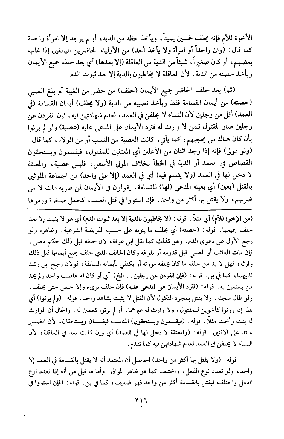 قوله : 16 ( حصته ) : أي يحلف ما ينوبه على حسب الفريضة الشرعية ، و ظاهره و لو رجع الأول عن دعوى الدم كذلك كما في نقل ابن عرفة لأن حلفه قبل ذلك حكم مضى ، فإن مات الغائب أو الصبي قبل قدومه أو بلوغه و كان الحالف الذي حلف جميع أيمانهم قبل ذلك وارثه فهل لابد من حلفه ما كان يحلفه مورثه ، أو يكتفي بأيمانه السابقة ؟ قولان ، رجح ابن رشد ثانيهما كما في ( بن ) .