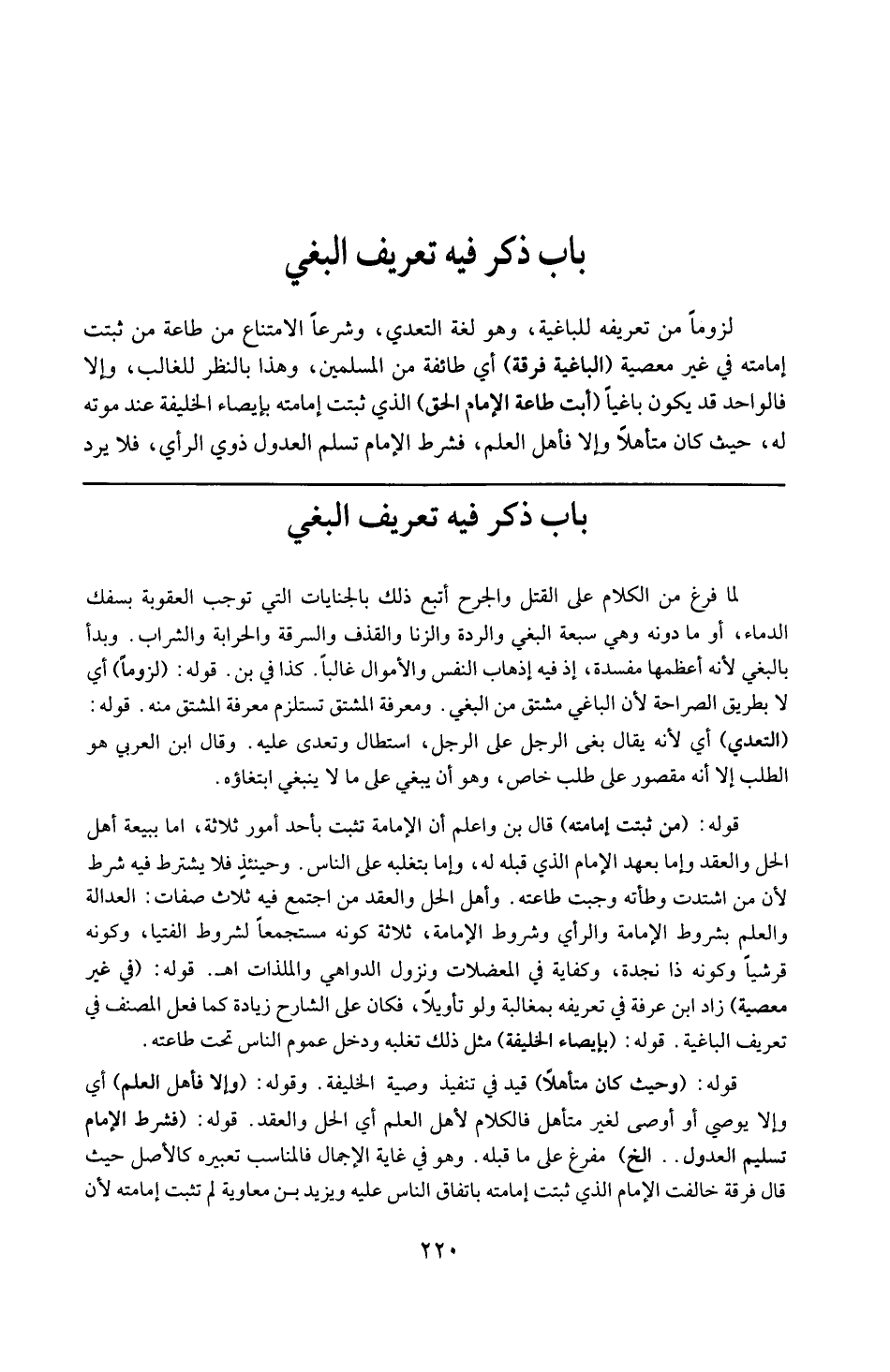 قوله : 16 ( فشرط الإمام تسليم العدول ) : الخ : مفرغ على ما قبله و هو في غاية الإجمال ؛ فالمناسب تعبيره كالأصل حيث قال : فرقة خالفت الإمام الذي ثبتت إمامته باتفاق الناس عليه ، و يزيد بن معاوية لم تثبت إمامته لأن