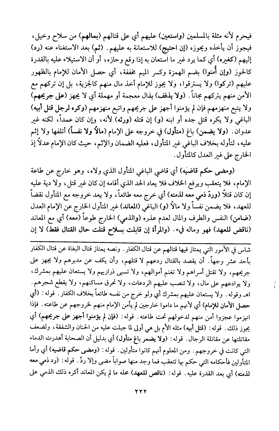 شاس في الأمور التي يمتاز فيها قتالهم عن قتال الكفار و نصه : يمتاز قتال البغاة عن قتال الكفار بأحد عشر وجهاً : أن يقصد بالقتال ردعهم لا قتلهم ، و أن يكف عن مدبرهم و لا يجهز على جريحهم ، و لا تقتل أسراهم و لا تغنم أموالهم و لا تسبى ذراريهم ، و لا يستعان عليهم بمشرك و لا يوادعهم على مال و لا تنصب عليهم الردعات ، و لا تحرّق مساكنهم و لا يقطع شجرهم ( اه ) و قوله و لا يستعان عليهم بمشرك و لو خرج من نفسه طائعا بخلاف الكفار .