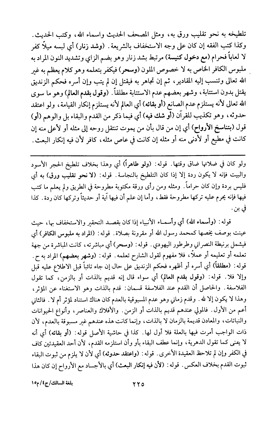 قوله : 16 ( لا نحو تقليب ورق به ) : أي فليس بردة و إن كان حراماً و مثله من رأى ورقة مكتوبة مطروحة في الطريق و لم يعلم ما كتب فيها فإنه يحرم عليه تركها مطروحة فقط ، و أما إن علم أن فيها اية أو حديثاً و تركها كان ردة كذا في ( بن ) .