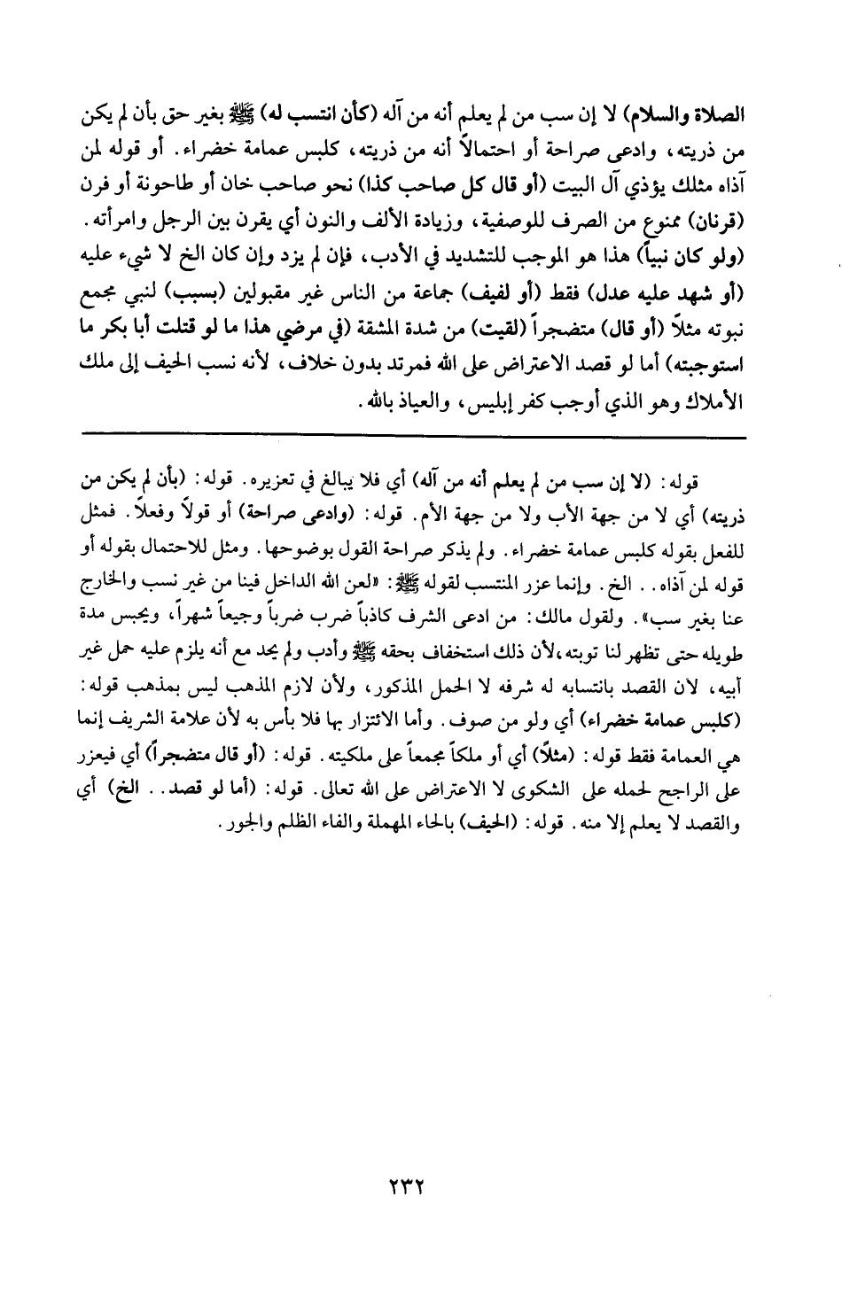 قوله : 16 ( و ادعى صراحة ) : أو قولا أو فعلا فمثل للفعل بقوله : كلبس عمامة خضراء ، و لم يذكر صراحة القول بوضوحها و مثل للاحتمال بقوله : أو قوله لمن اذاه إلخ ، و إنما عرز المنتسب لقوله : ( لعن الله الداخل فينا من غير نسب و الخارج عنا بغير سبب ) و لقول مالك : من ادعى الشرف كاذباً ضرب ضرباً و جيعاً ثم شهر و يحبس مدة طويلة حتى تظهر لنا توبته ؛ لأن ذلك استخفاف بحقه و أدب و لم يحد مع أنه يلزم عليه حمل غير أبيه على أمه ؛ لأن القصد بانتسابه له شرفه لا الحمل المذكور ، و لأن لازم المذهب ليس بمذهب .
