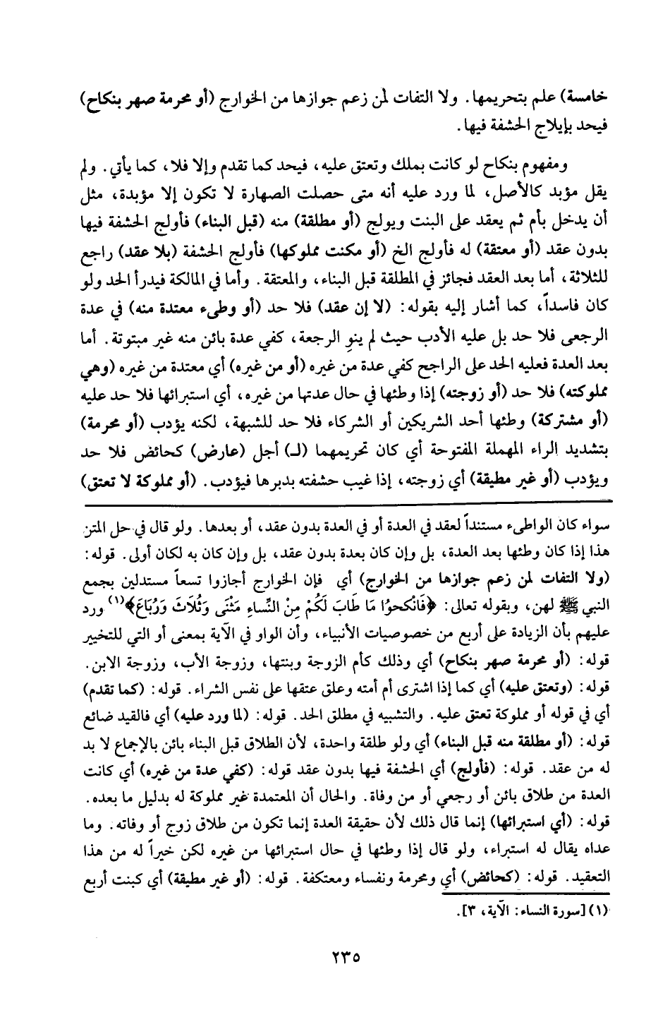 قوله : 16 ( و لا التفات لمن زعم جوازها من الخوارج ) : أي فإن الخوارج أجازوا تسعاً مستدلين بجمع النبي لهن و بقوله تعالى : { فانْكِحُوا ما طابَ لَكمن منَ النسَاء مَثْنَى و ثُلاَثَ و رُباع } و ردّ عليهم بأن الزيادة على أربع من خصوصيات الأنبياء و أن الواو في الآية بمعنى أو التي للتخيير .