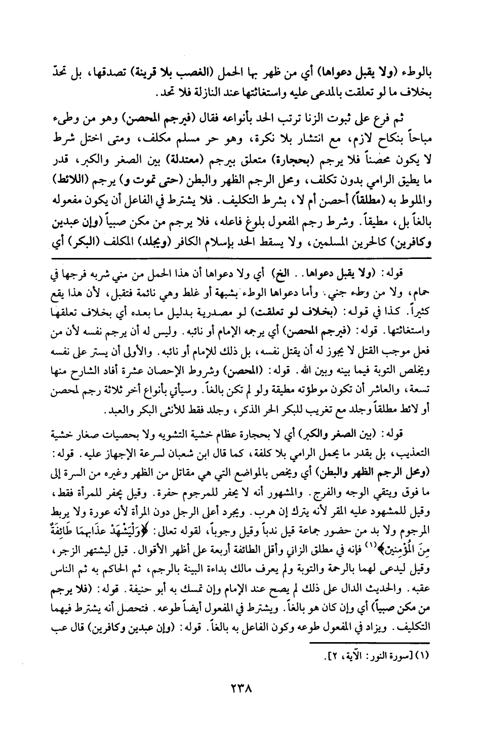 قوله : 16 ( المحصن ) : و شروط الإحصان عشرة أفاد الشارح منها تسعة . و العاشر أن تكون موطوءته مطيقة و لو لم تكن بالغاً و سيأتي بأنواع ثلاثة رجم لمحصن أو لائط مطلقاً ، و جلد مع تغريب للبكر الحر الذكر ، و جلد فقط للأنثى البكر و العبد .