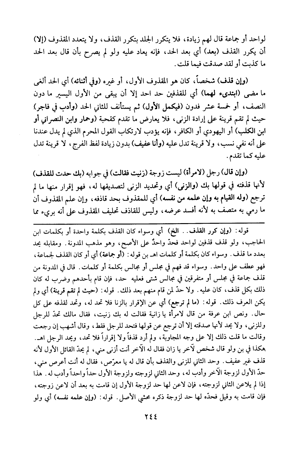 قوله : ( ما لم ترجع ) : أي عن الإقرار بالزنا فلا تحد له وتحد لقذفه على كل حال ونص ابن عرفة من قال لامرأة يا رانية فقالت له بك زنيت فقال مالك : تحد للرجل وللزنا ، ولا يحد لأنها صدقته إلا أن ترجع عن قولها فتحد للرجل فقط ، وقال أشهب : إن رجعت وقالت ما قلت ذلك إلا على وجه المجاوبة ولم أرد قذفاً ولا إقراراً فلا تحد ويحد الرجل ( اه ) هكذا في ( بن ) ولو قال شخص لآخر يا زاني فقال له الآخر أنت أزنى مني لم يحد القائل الأول لأنه قذف غير عفيف وجد الثاني للزنا والقذف ، فإن قال له يا معرص فقال له أنت أعرص مني حد الأول لزوجة الآخر وأدب له ، وحد الثاني لزوجته ولزوجة الأول حدّاً واحداً ، وأدب له ، هذا إذا لم يلاعن عن الثاني لزوجته ، فإن لاعتن لها حد لزوجة الأول إن قامت به بعد أن لاعن زوجته ، فإن قامت به قبل فحده لها حد لزوجته ذكره محشي الأصل .
