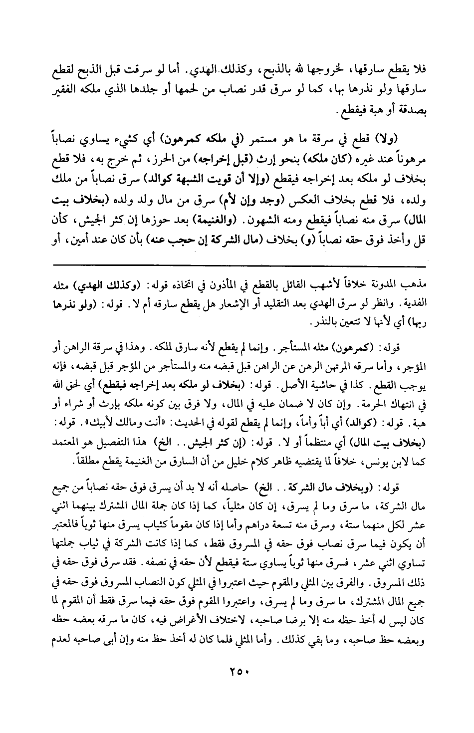 قوله : 16 ( و بخلاف مال الشركة ) : إلخ : حاصله أنه لابد أن يسرق فوق حقه نصاباً من جميع مال الشركة ما سرق و ما لم يسرق ، و إن كان مثلياً كما إذا كان جملة المال المشترك بينهما اثنى عشر لكل منهما ستة و سرق منه تسعة دراهم ، و أما إذا كان مقوماً كثياب يسرق منها ثوباً فالمعتبر أن يكون فيما سرق نصاب فوق حقه في المسروق فقط كما إذا كانت الشركة في ثياب جملتها تساوي اثنى عشرة فسرق منها ثوباً يساوي ستة فيقطع ، لأن حقه في نصفه فقد سرق فوق حقه في ذلك المسروق نصاباً ، و الفرق بين المثلى و المقوم حيث اعتبروا في المثلى كون النصاب المسروق فوق حقه في جميع المال المشترك ما سرق و ما لم يسرق ، و اعتبروا في المقوم فوق حقه فيما سرق فقط أن المقوم لما كان ليس له أخذ حظه منه إلا برضا صاحبه و ما بقى كذلك ، و أما المثلى فلما كان له أخذ حظه منه و إن أبى صاحبه لعدم