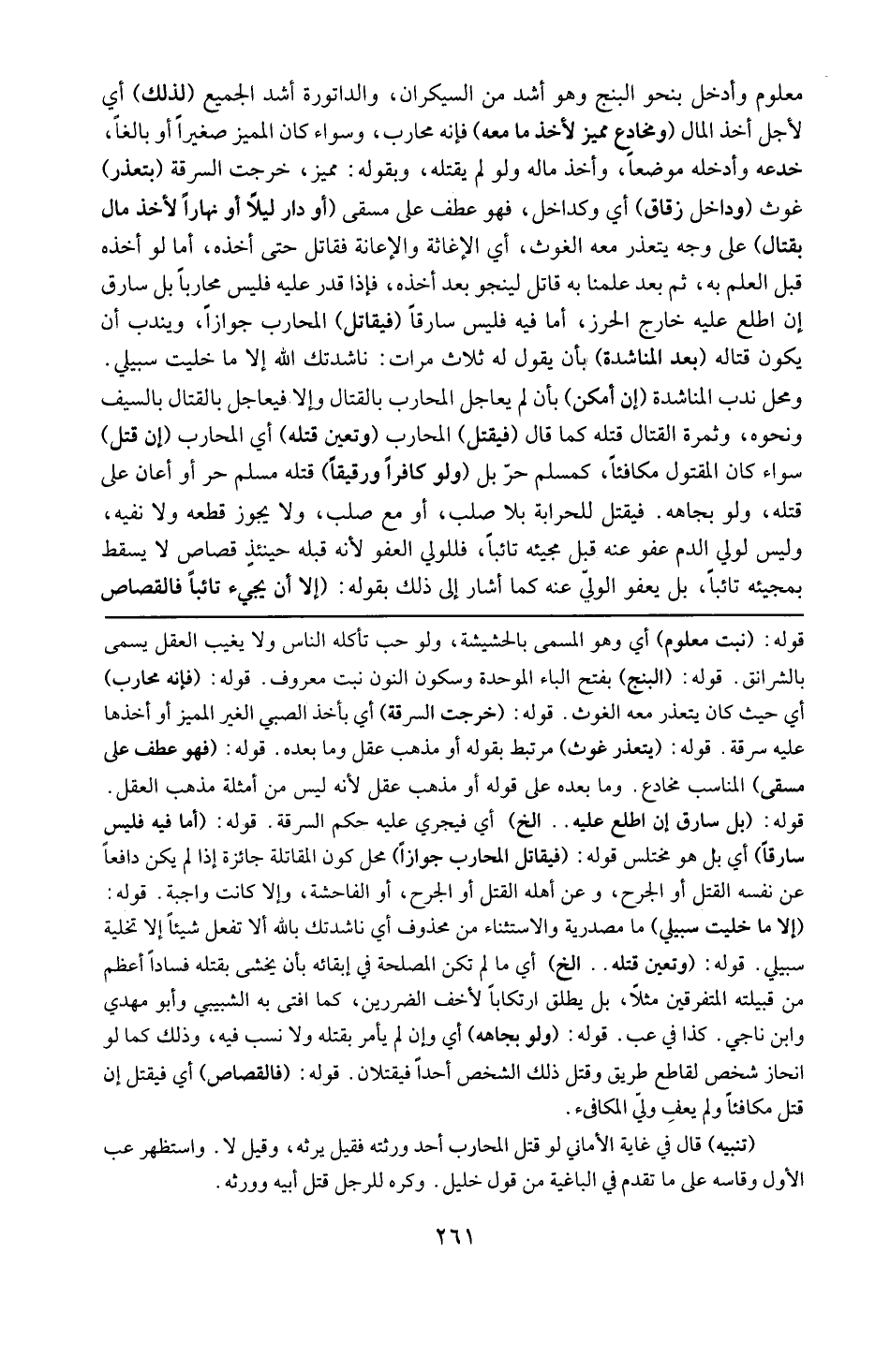 قوله : 16 ( و تعين قتله ) الخ : أي ما لم تكن المصلحة في إبقائه بأن يخشى بقتله فساد أعظم من قبيلته المتفرقين مثلا بل بطلق ارتكاباً لأخف الضررين كما أفتى به الشبيى و أبو مهدى و ابن ناجى كذا في ( عب ) .
