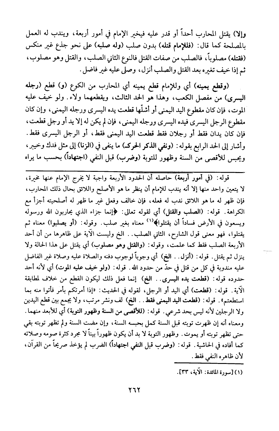قوله : 16 ( الصلب و القتل ) : أي لقوله تعالى : { إنَّما جَزَاءُ الَّذينَ يحارِبونَ الله و رسولهُ و يَسعونَ في الأرضِ فساداً أنْ يُقتَّلوا } معناه بغير قوله : ( أو يصُلَّبوا ) معناه : ( ثم يقتلوا ) فهو معنى قول الشارح الثاني الصلب إلخ و ليست الآية ظاهرها من أن أحد الأربعة الصلب فقط كما علمت .