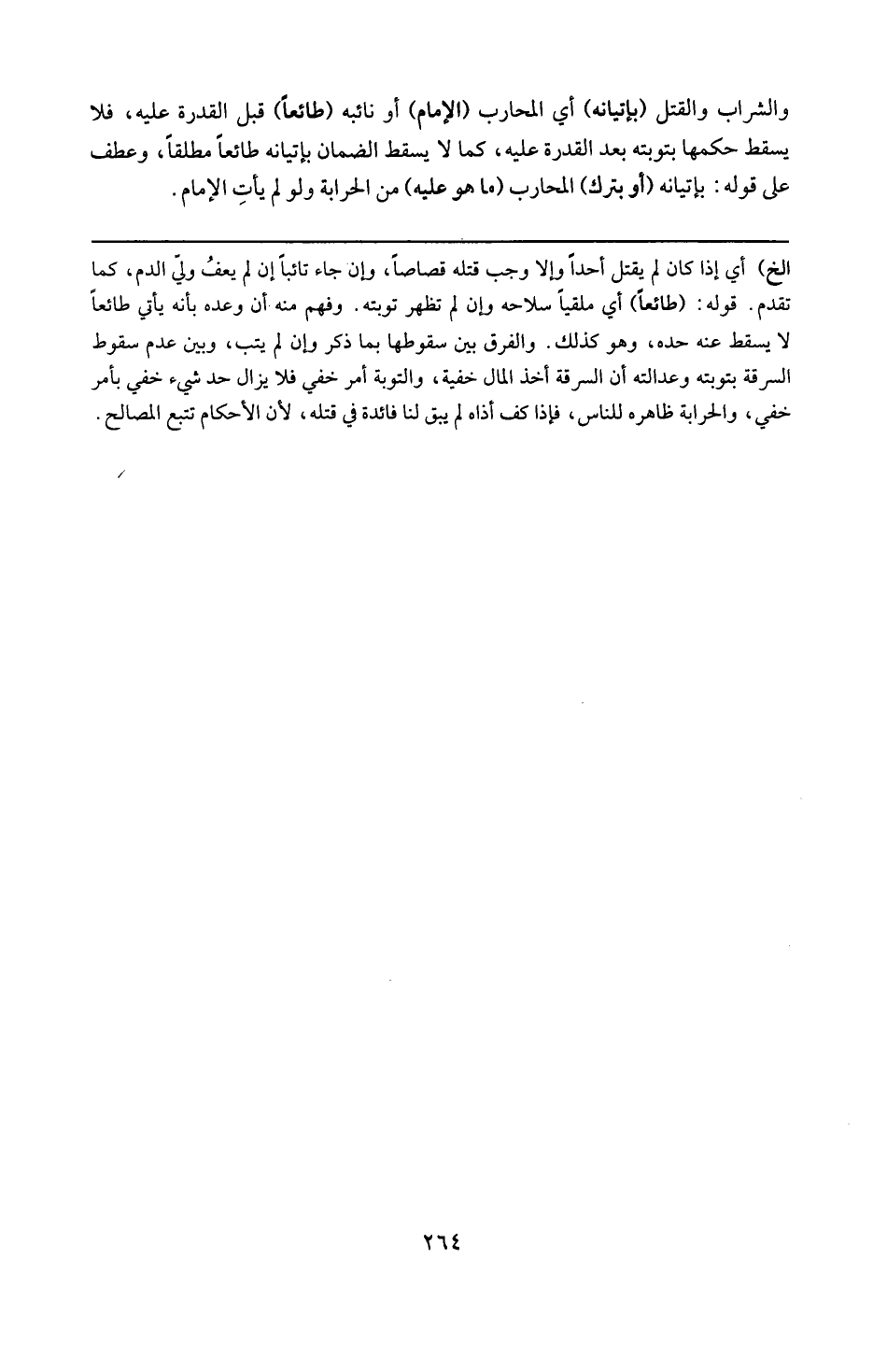 قوله : 16 ( طائعالا ) : أي ملقياً سلاحه و إن لم تظهر توبته ، و فهم منه أن وعده بأنه يأتي طائعا لا يسقط عنه حده و هو كذلك ، و الفرق بين سقوطها بما ذكر و إن لم يتب و بين عدم سقوط حدّ السرقة بتوبته و عدالته أن السرقة أخذ المال خفية و التوبة أمر خفي فلا يزال حد شيء خفى بأمر خفي ، و الحرابة ظاهرة للناس فإذا كف أذاه لم يبق لنا فائدة في قتله لأن الأحكام تتبع المصالح .