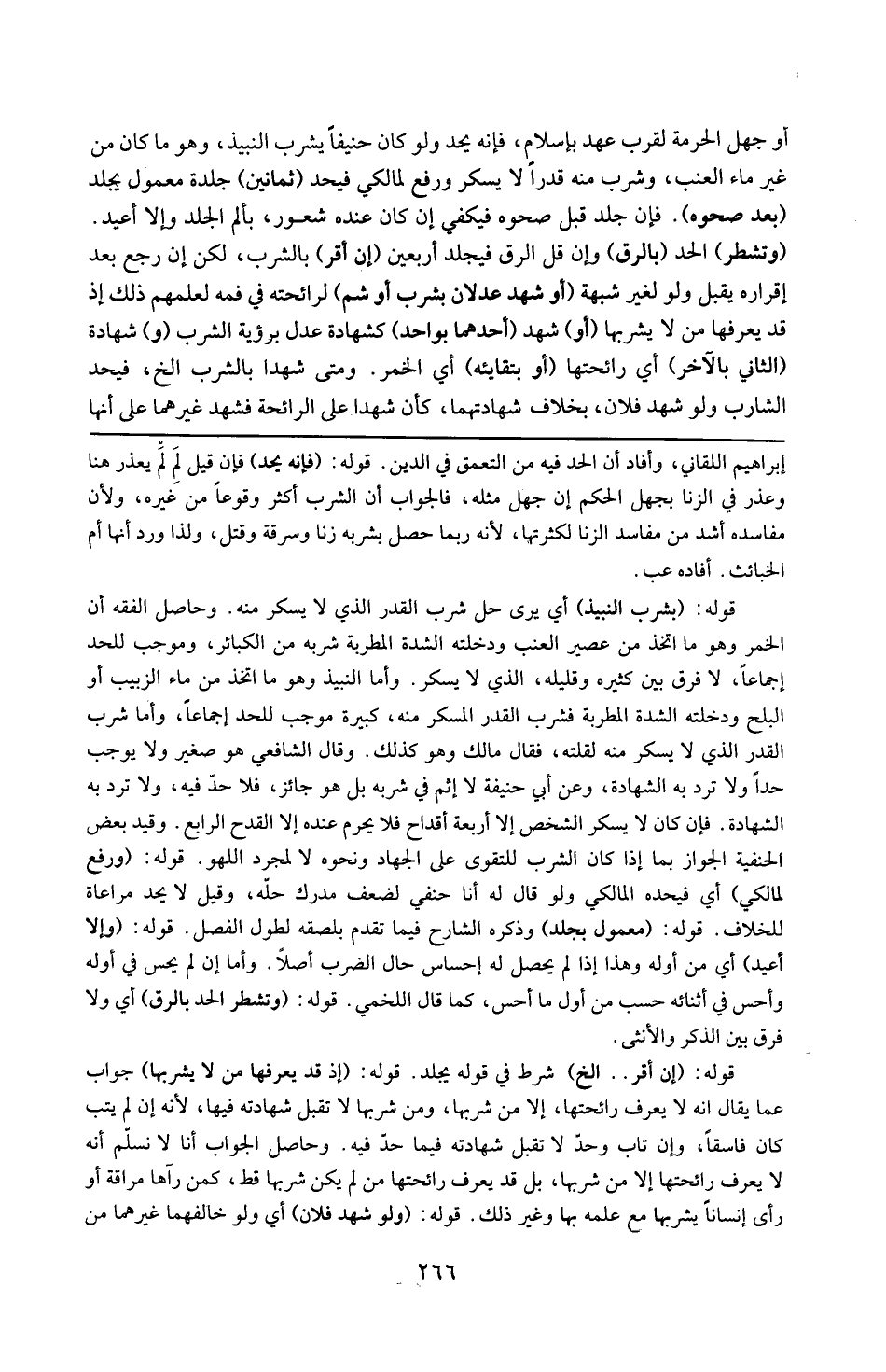 و حاصل الفقه أن الخمر و هو ما اتخذ من عصير العنب و دخلته الشدة المطربة شربه من الكبائر و موجب للحد إجماعاً لا فرق بين كثيره و قليله الذي لا يسكر ، و أما النبيذ و هو ما اتخذ من ماء الزبيب أو البلح و دخلته الشدة فشرب القدر المسكر منه كبيرة ، و موجب للحد إجماعاً ، و أملا شرب القدر الذي لا يسكر منه لقلته فقال مالك : هو كذلك . و قال الشافعي : هو صغيرة و لا يوجب حداً و لا ترد به الشهادة . و عن أبي حنيفة : لا إثم في شربه بل هو جائز فلا حد فيه و لا ترد به الشهادة فإن كان لا يسكر الشخص إلا أربعة أقداح فلا يحرم إلا القدح الرابع ، و قيد بعض الحنيفة الجواز بما إذا كان الشرب للتقوى على الجهاد و نحوه لا لمجرد اللهو .